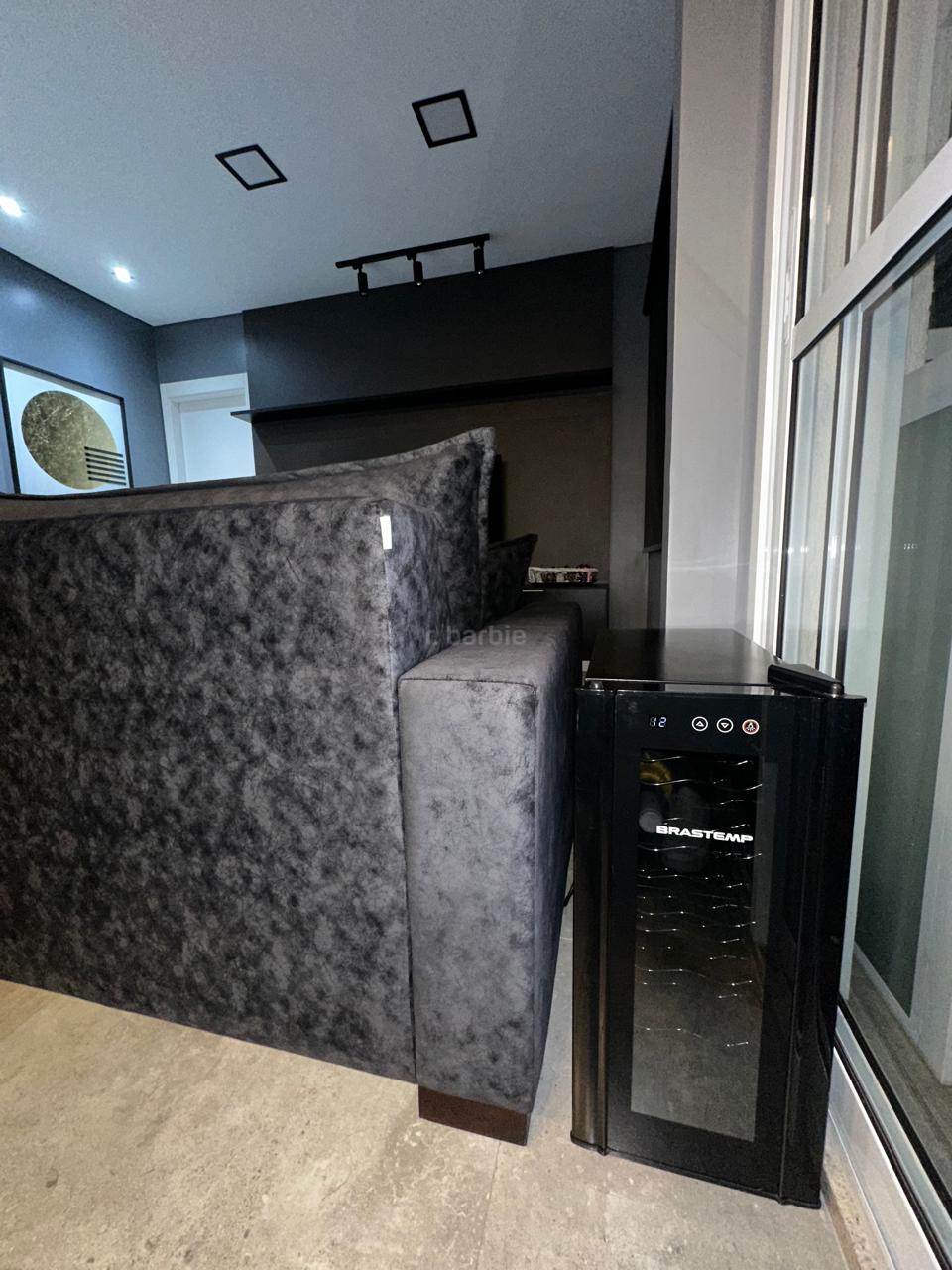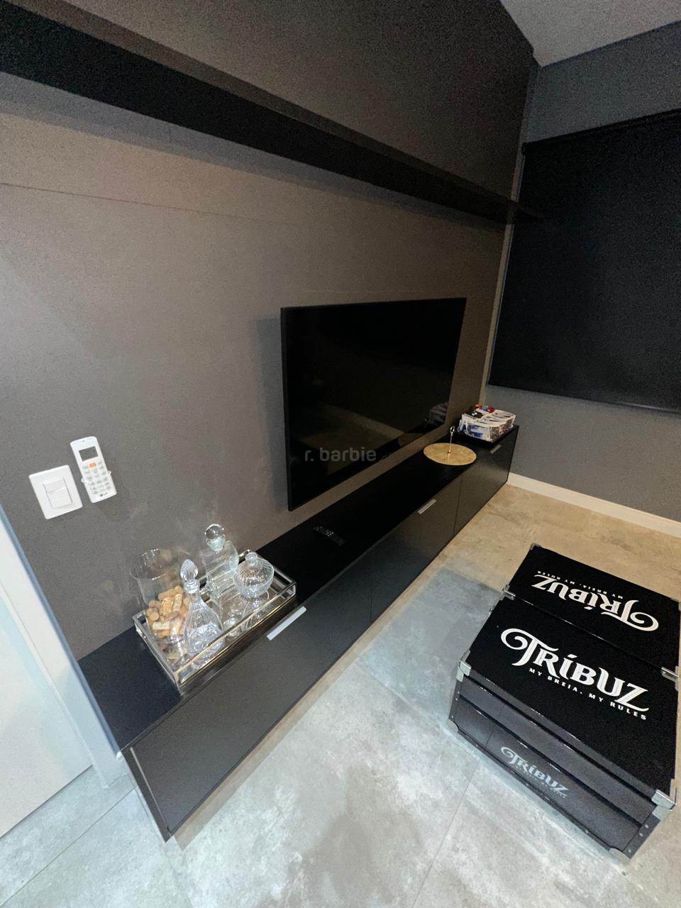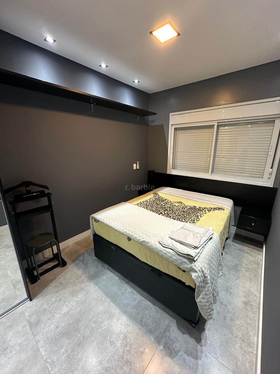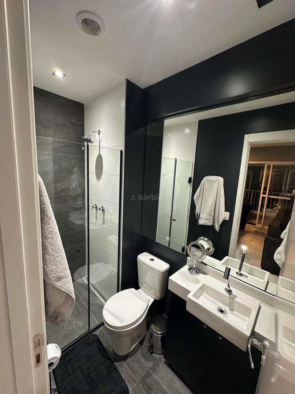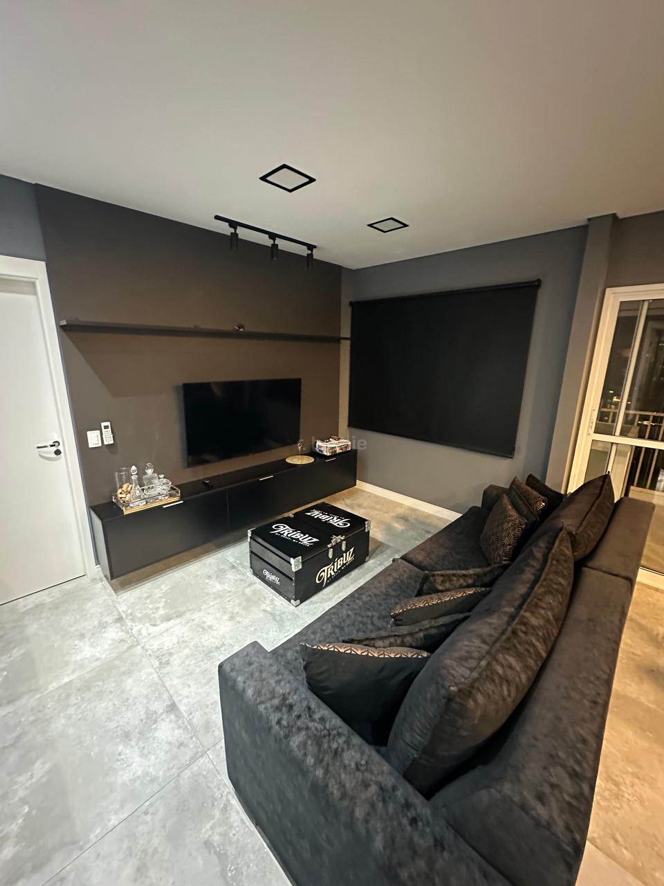 Apartamento mobiliado com 1 suíte em Alphaville, 54 metros, living para 2 ambientes, cozinha ampla com armários planejados e eletrodomésticos, 2 banheiros, sacada envidraçada, andar alto, vista livre, face norte e 2 vagas de garagem.