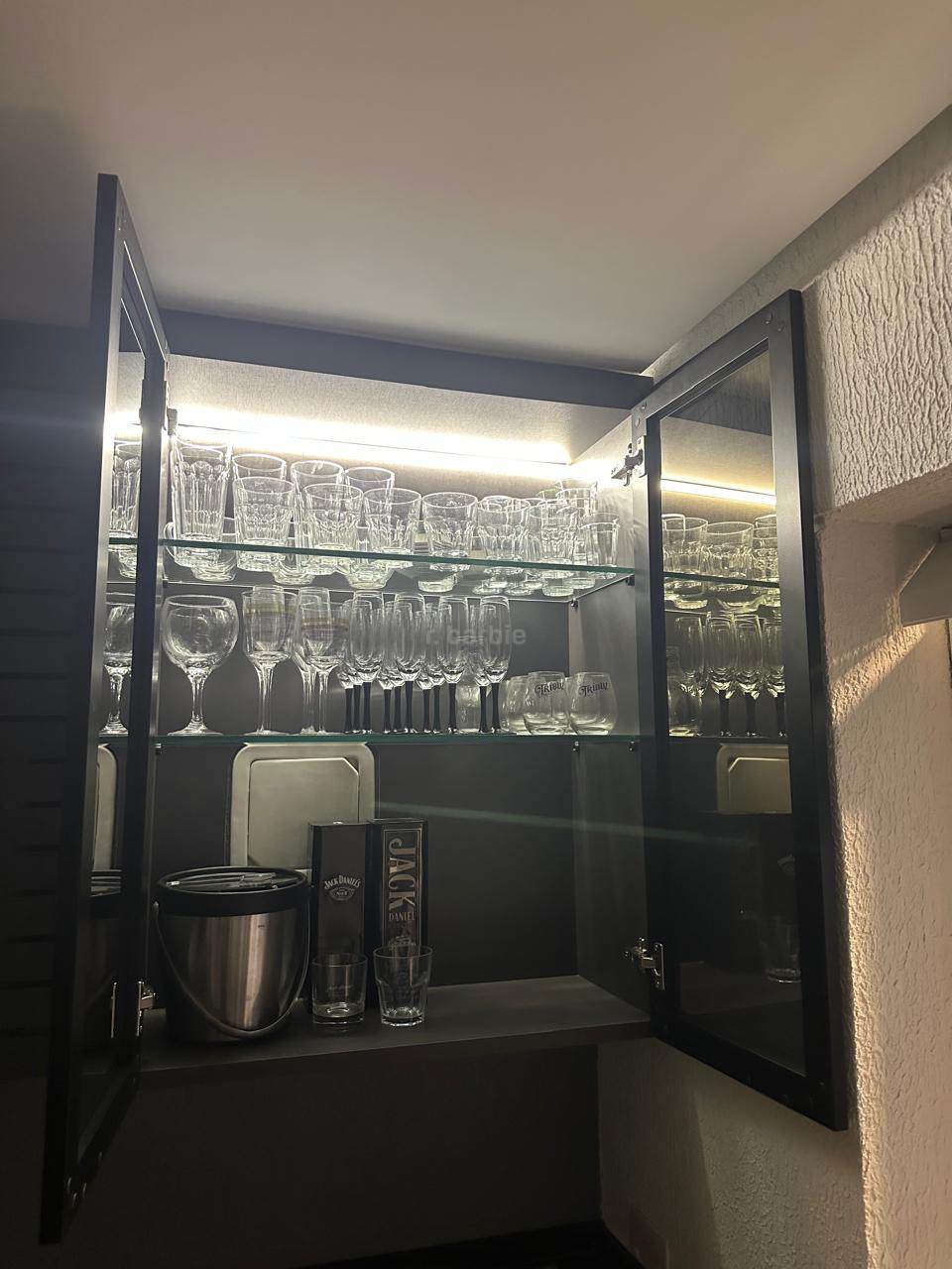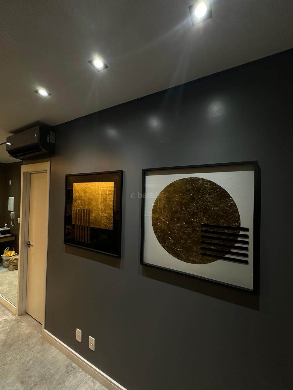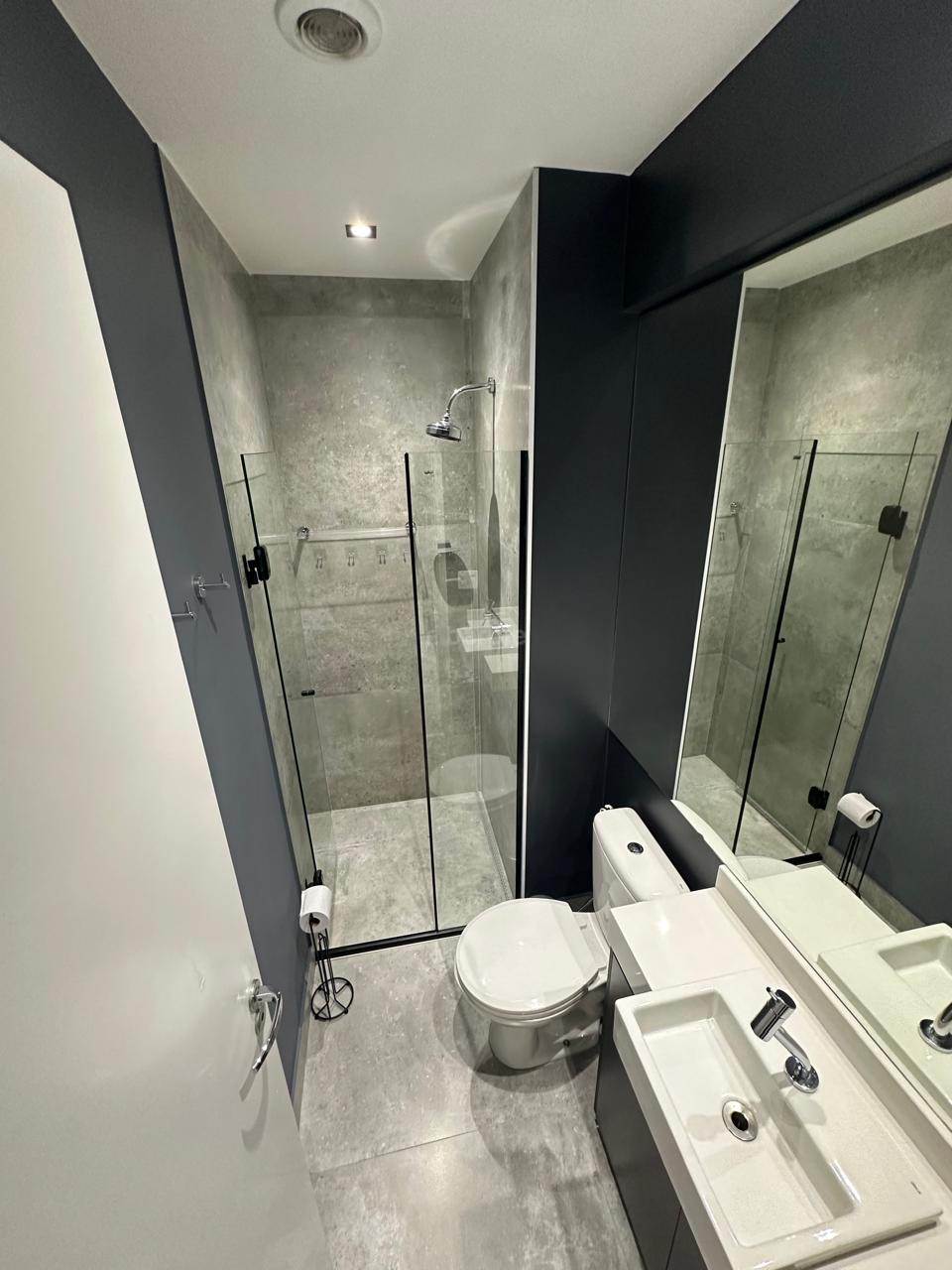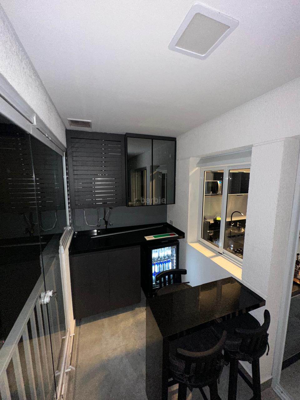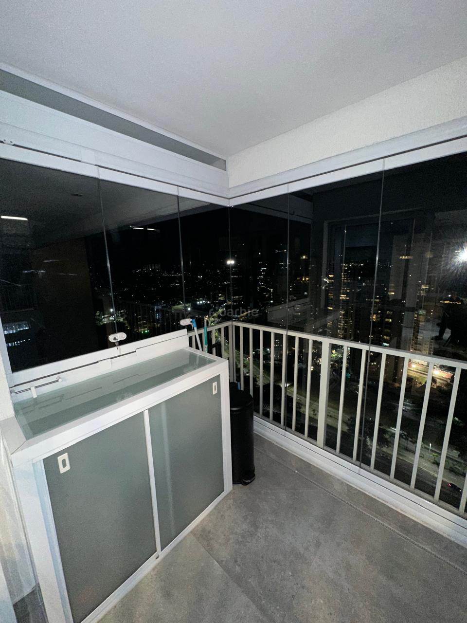 Apartamento mobiliado com 1 suíte em Alphaville, 54 metros, living para 2 ambientes, cozinha ampla com armários planejados e eletrodomésticos, 2 banheiros, sacada envidraçada, andar alto, vista livre, face norte e 2 vagas de garagem.