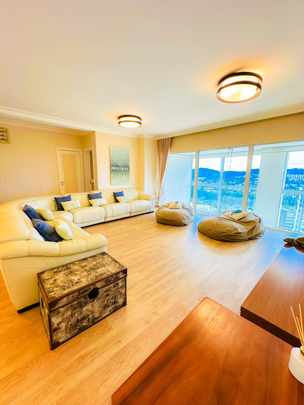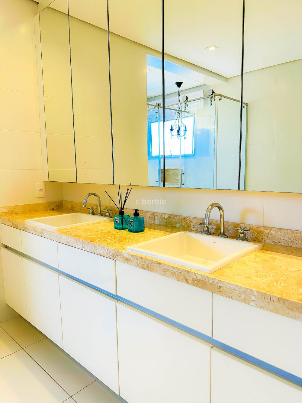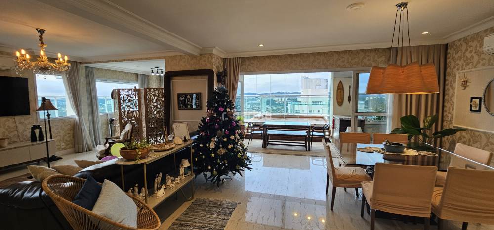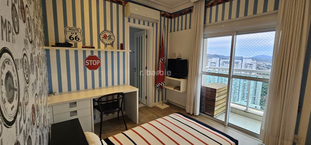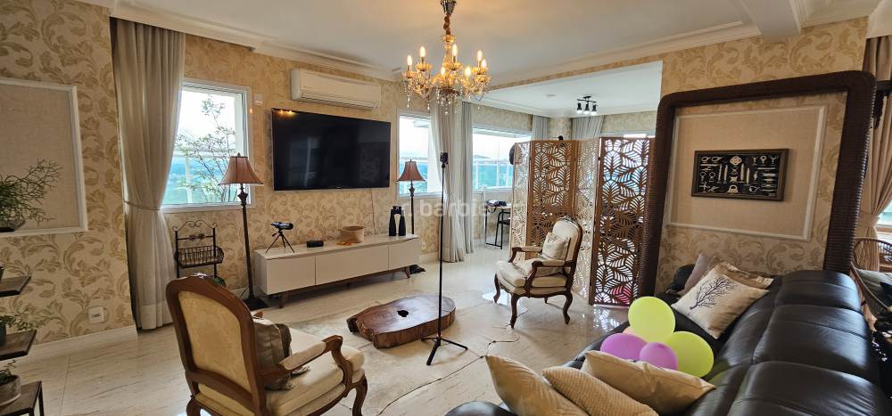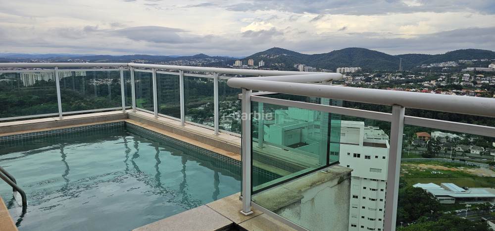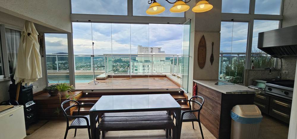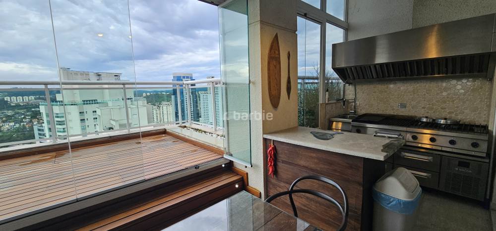 Apartamento duplex com 4 suítes em Alphaville, 342 metros, living para 3 ambientes, escritório, cozinha ampla com armários planejados, lavanderia, lavabo, área gourmet com churrasqueira e piscina privativa, vista para o pôr do sol e 8 vagas de garagem.