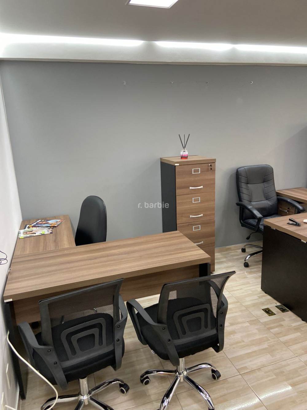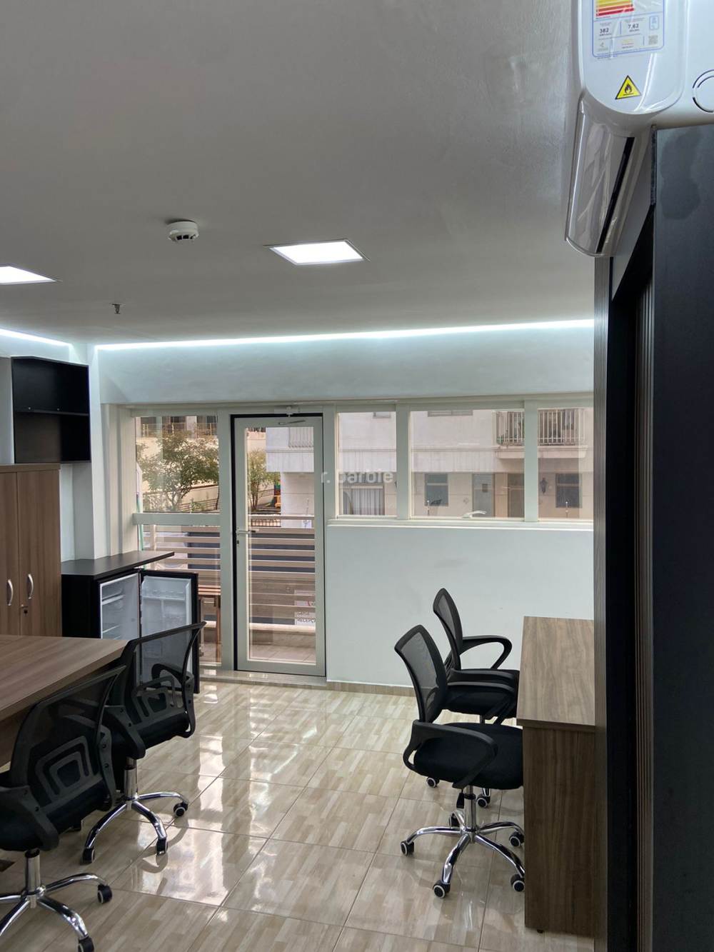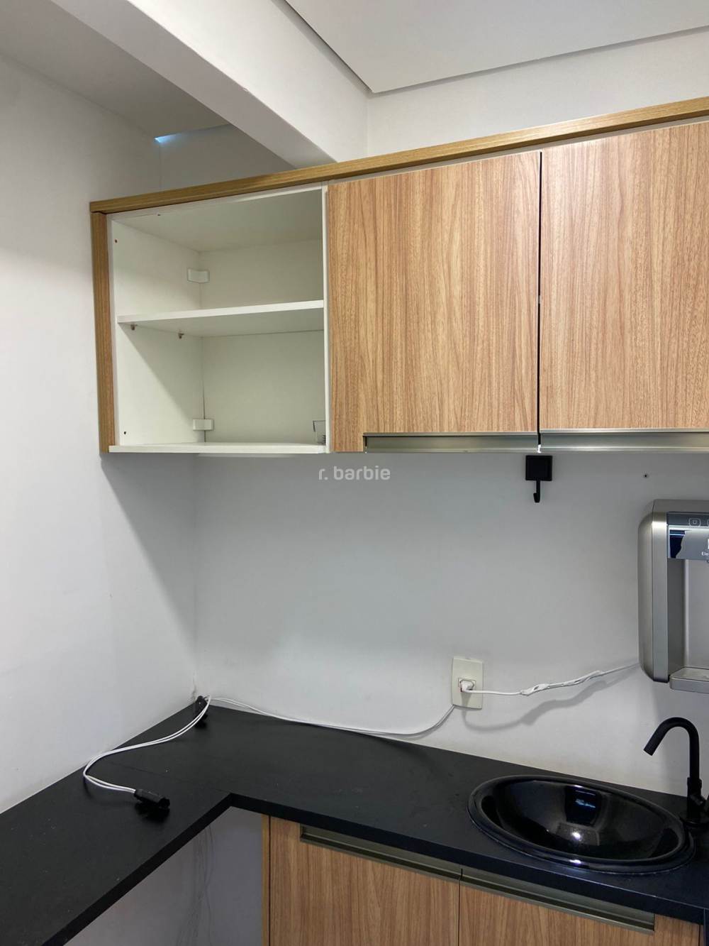 Sala comercial mobiliada em Alphaville, 33 metros, living com estações de trabalho, ar condicionado, copa, banheiro e 1 vaga de garagem.