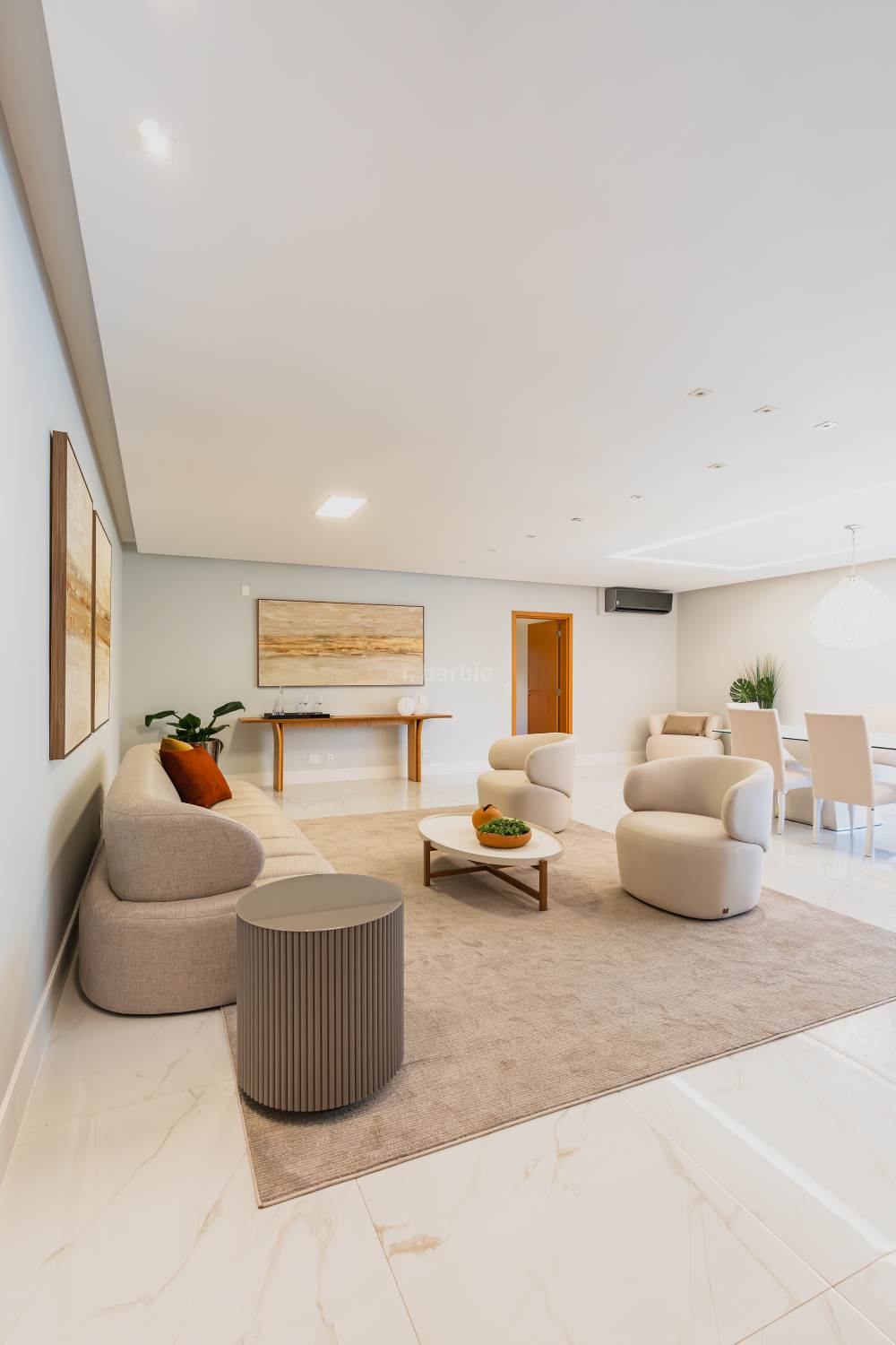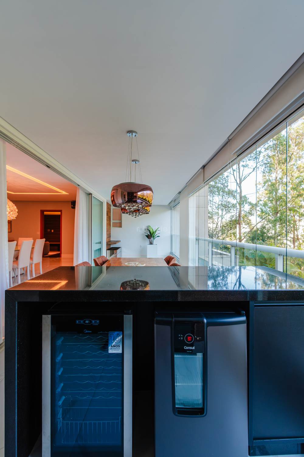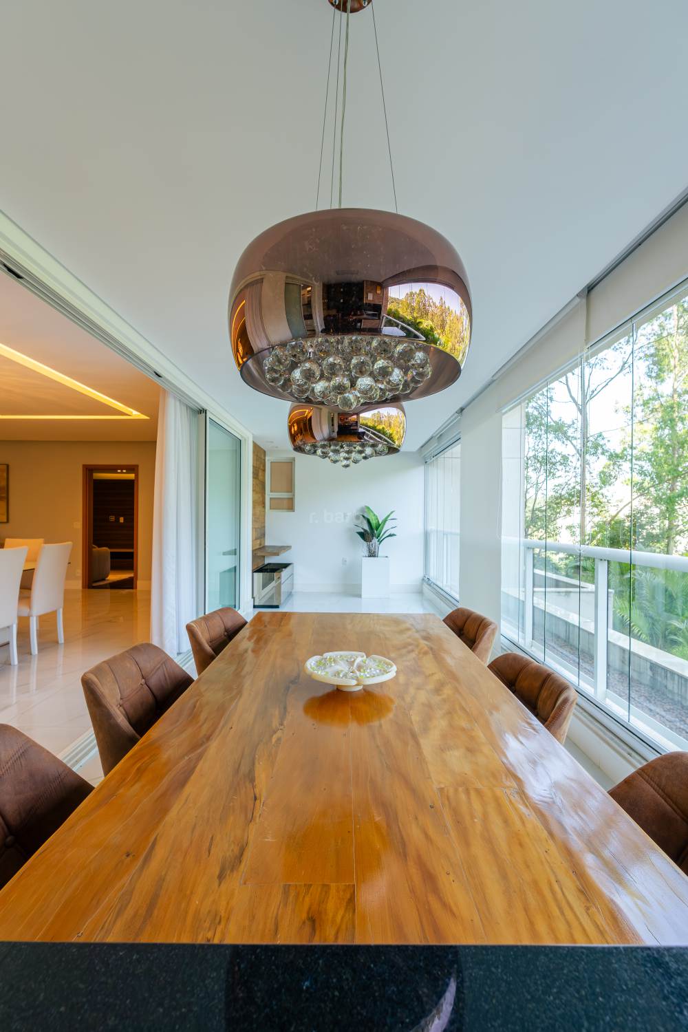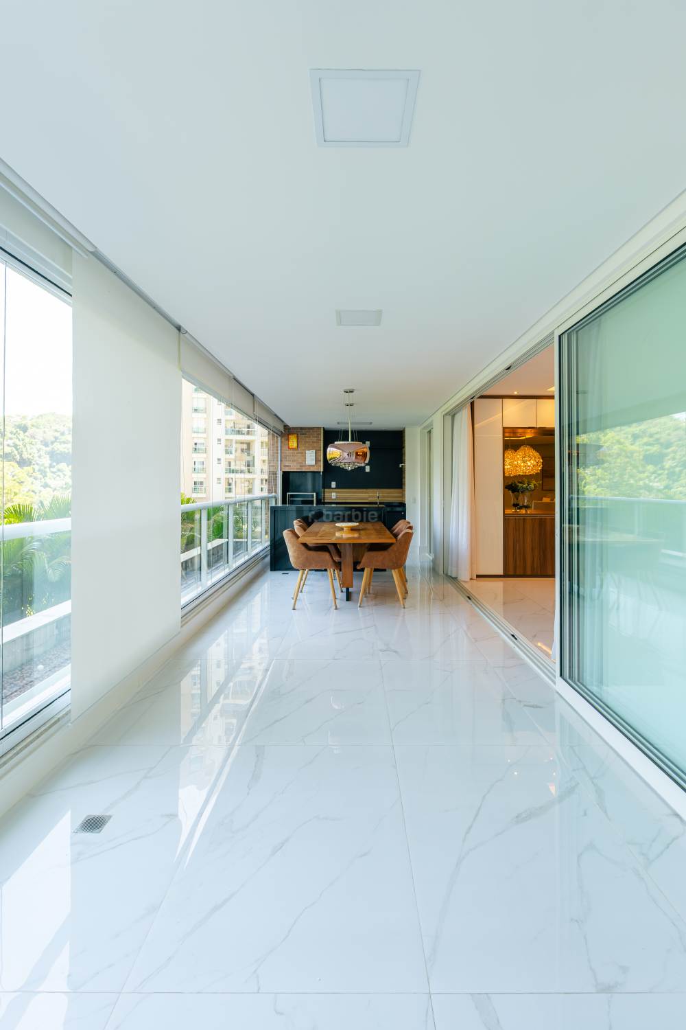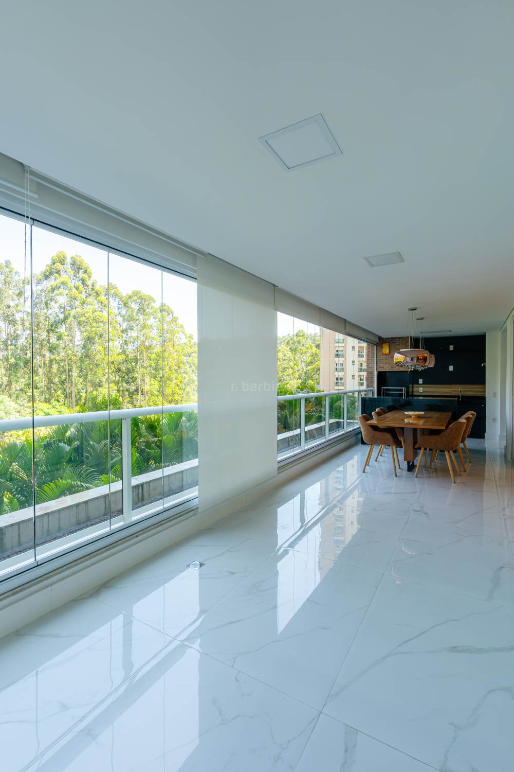 Apartamento semi mobiliado com 3 suítes em Alphaville, 224 metros, living para 3 ambientes, cozinha ampla com armários planejados ID Móveis e eletrodomésticos, ar condicionado, lavanderia despensa, lavabo, varanda gourmet com churrasqueira a carvão, vista para mata, depósito no andar e 4 vagas de garagem.