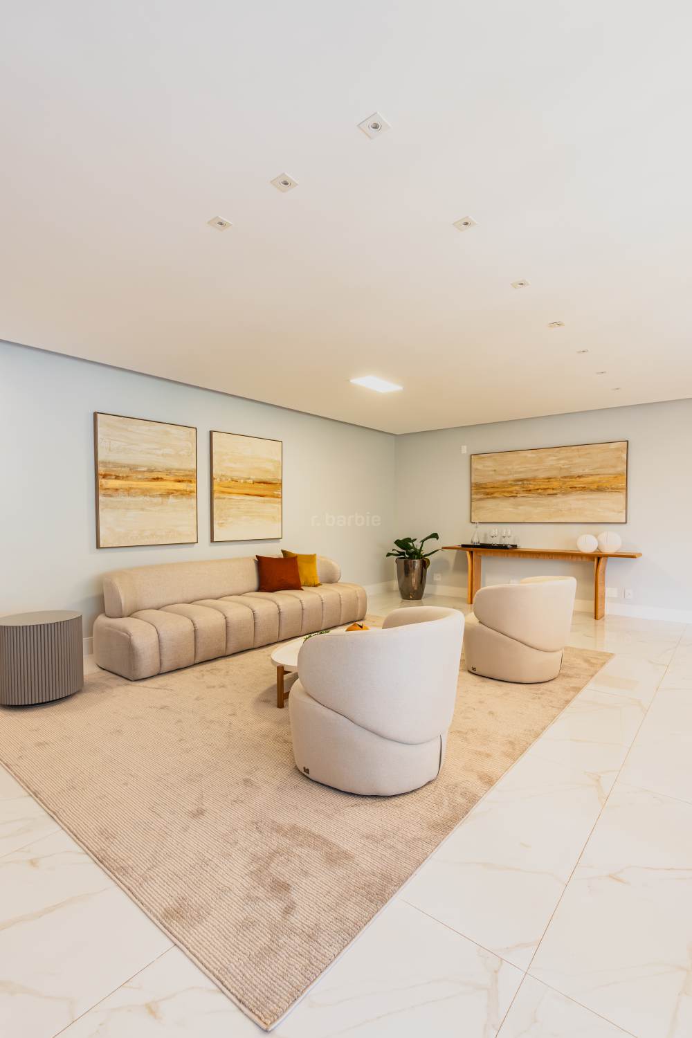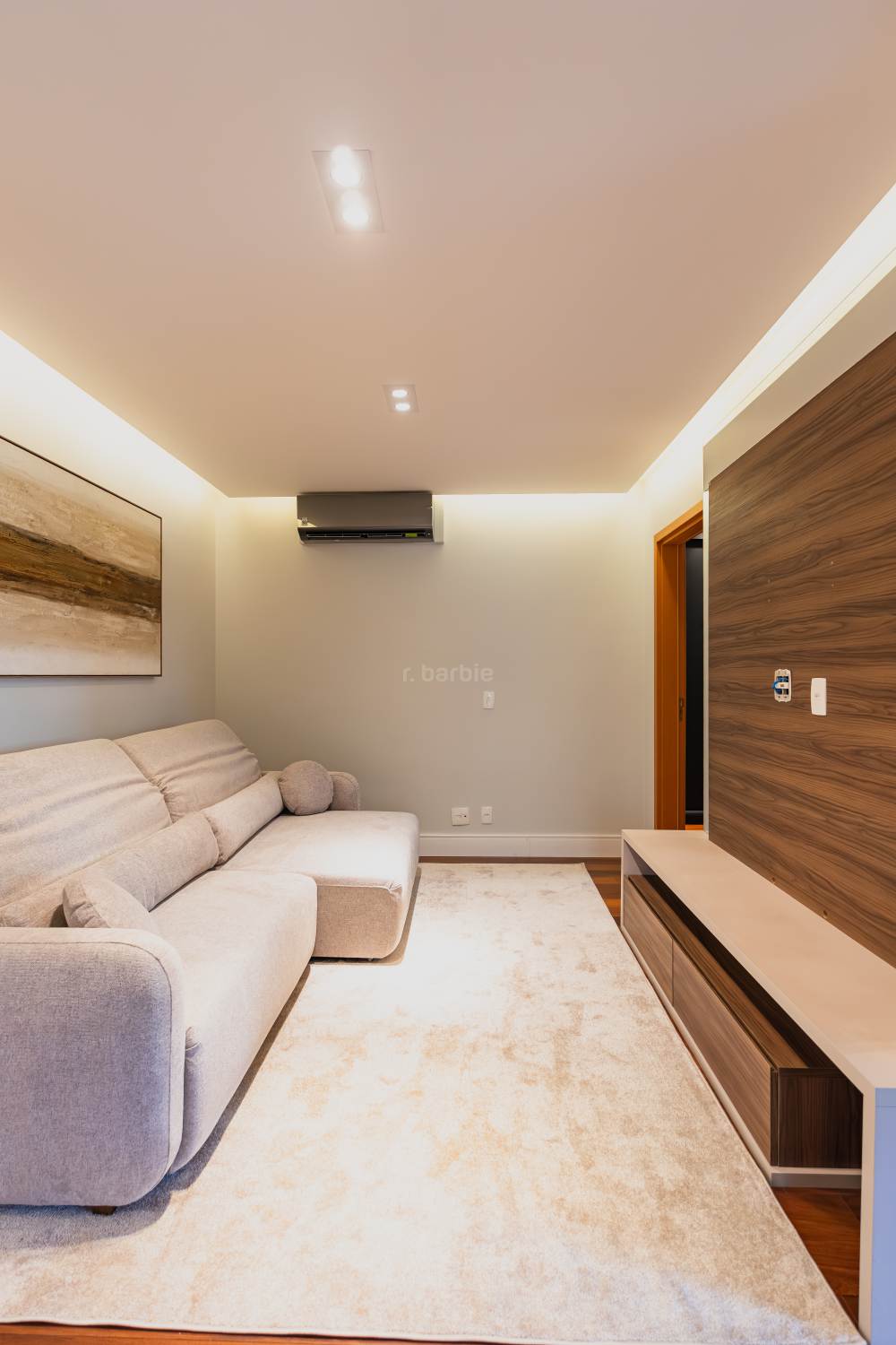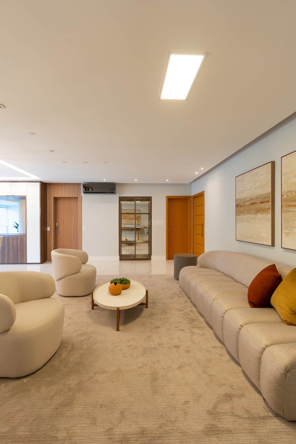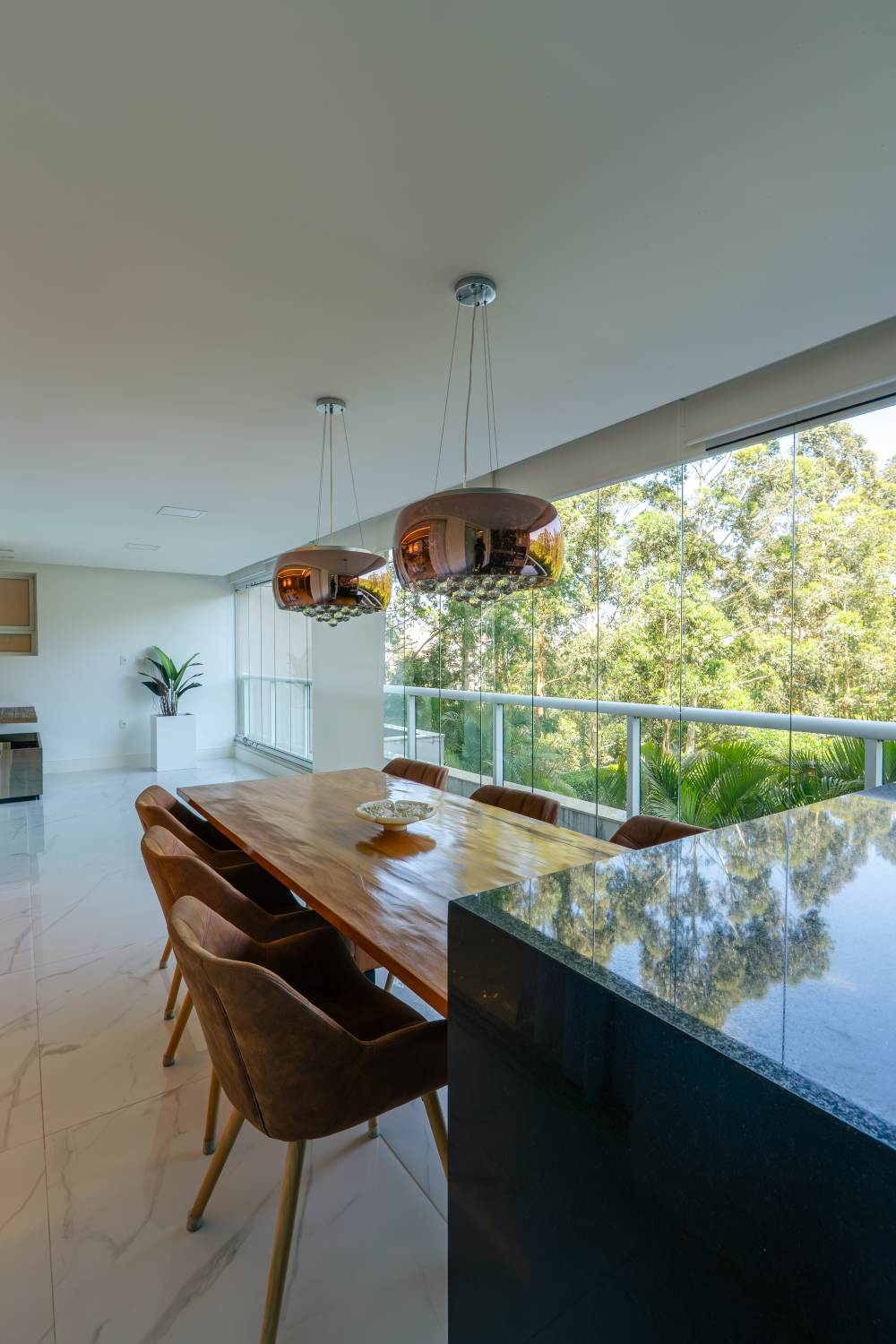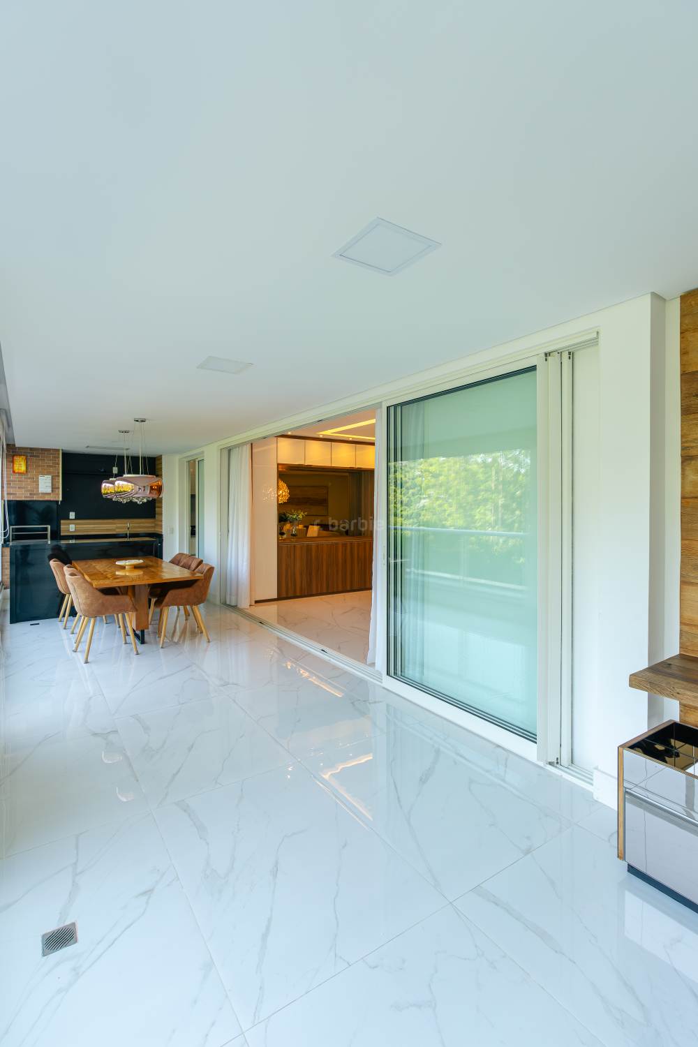 Apartamento semi mobiliado com 3 suítes em Alphaville, 224 metros, living para 3 ambientes, cozinha ampla com armários planejados ID Móveis e eletrodomésticos, ar condicionado, lavanderia despensa, lavabo, varanda gourmet com churrasqueira a carvão, vista para mata, depósito no andar e 4 vagas de garagem.