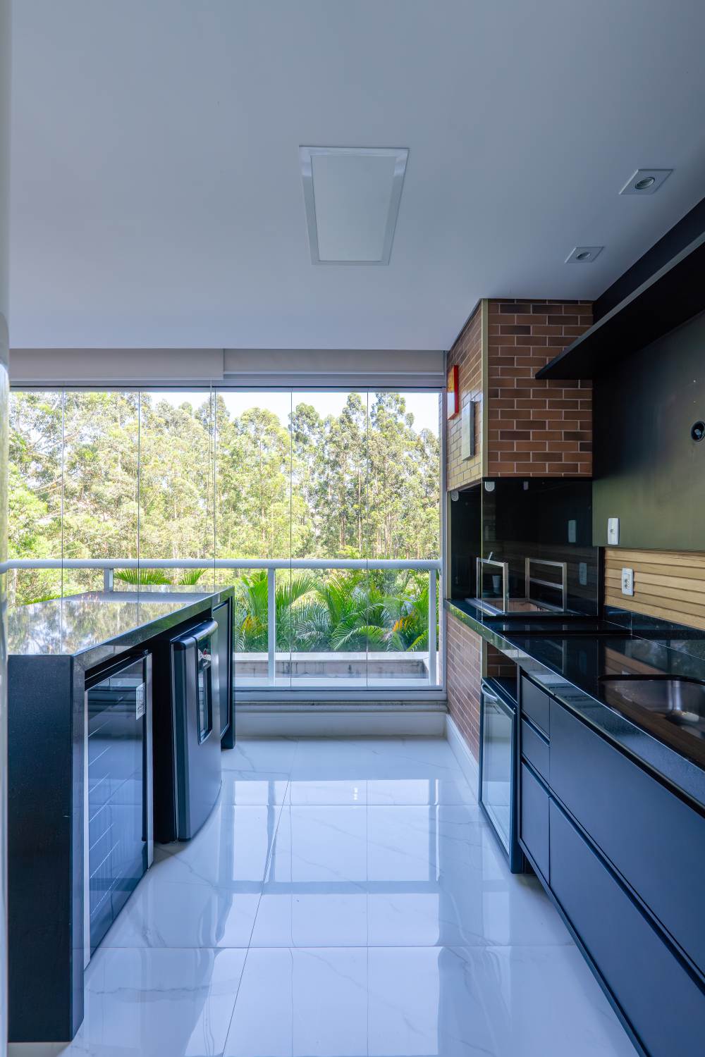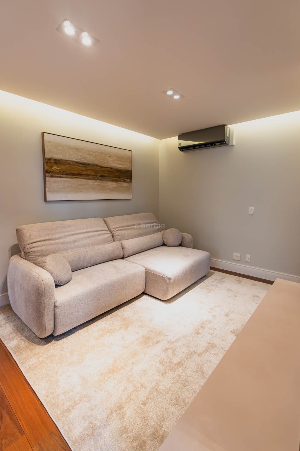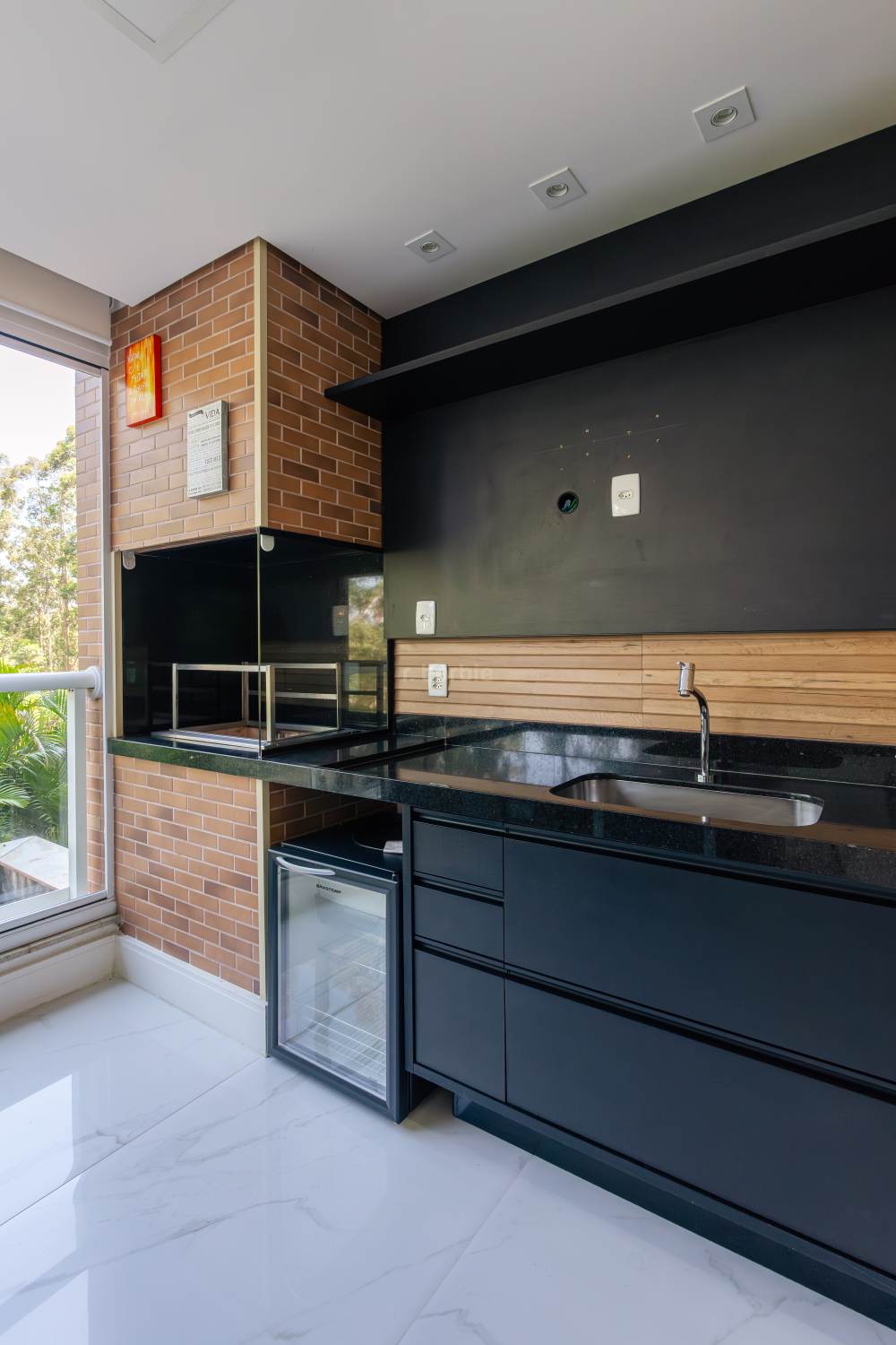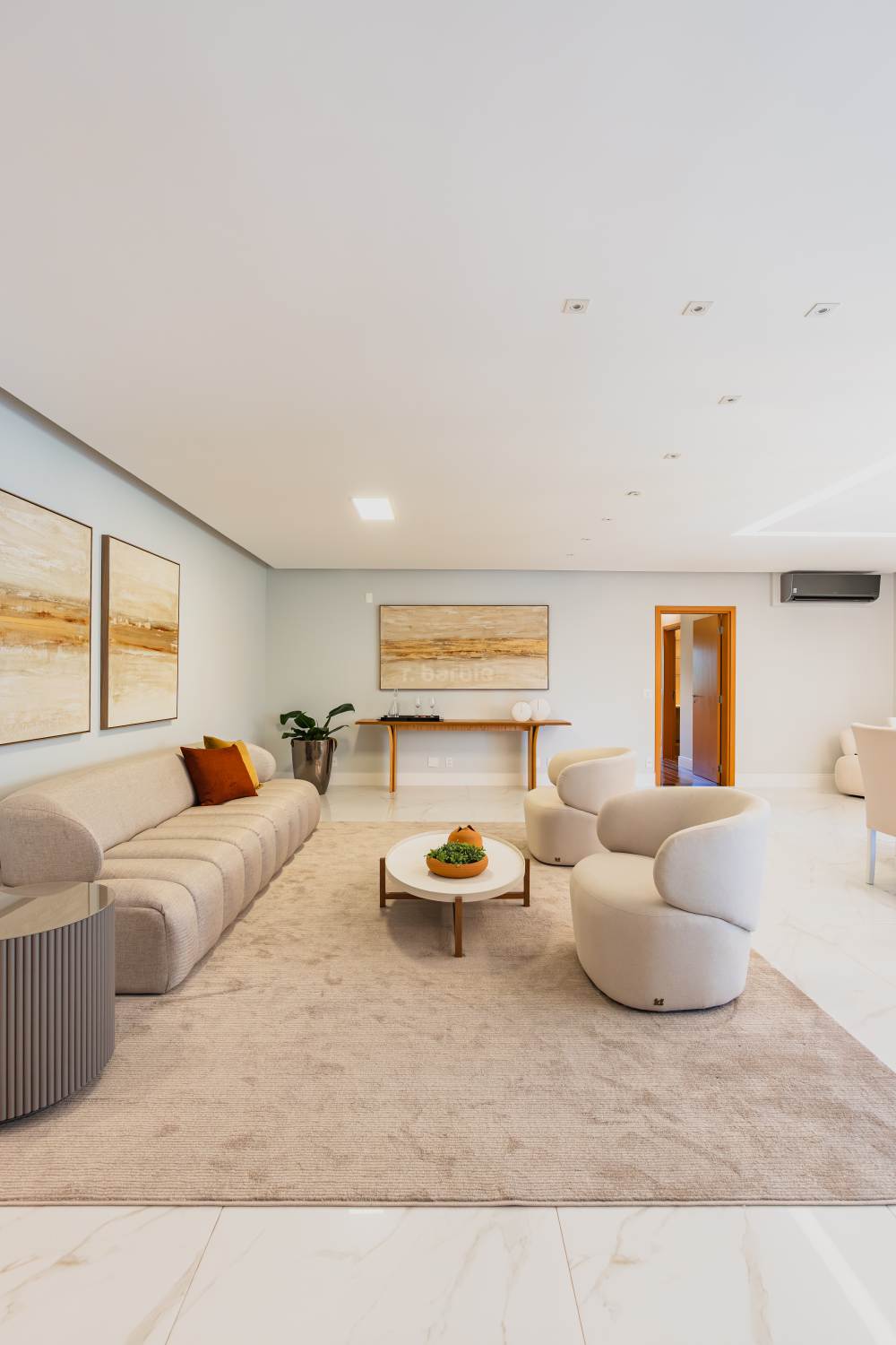 Apartamento semi mobiliado com 3 suítes em Alphaville, 224 metros, living para 3 ambientes, cozinha ampla com armários planejados ID Móveis e eletrodomésticos, ar condicionado, lavanderia despensa, lavabo, varanda gourmet com churrasqueira a carvão, vista para mata, depósito no andar e 4 vagas de garagem.
