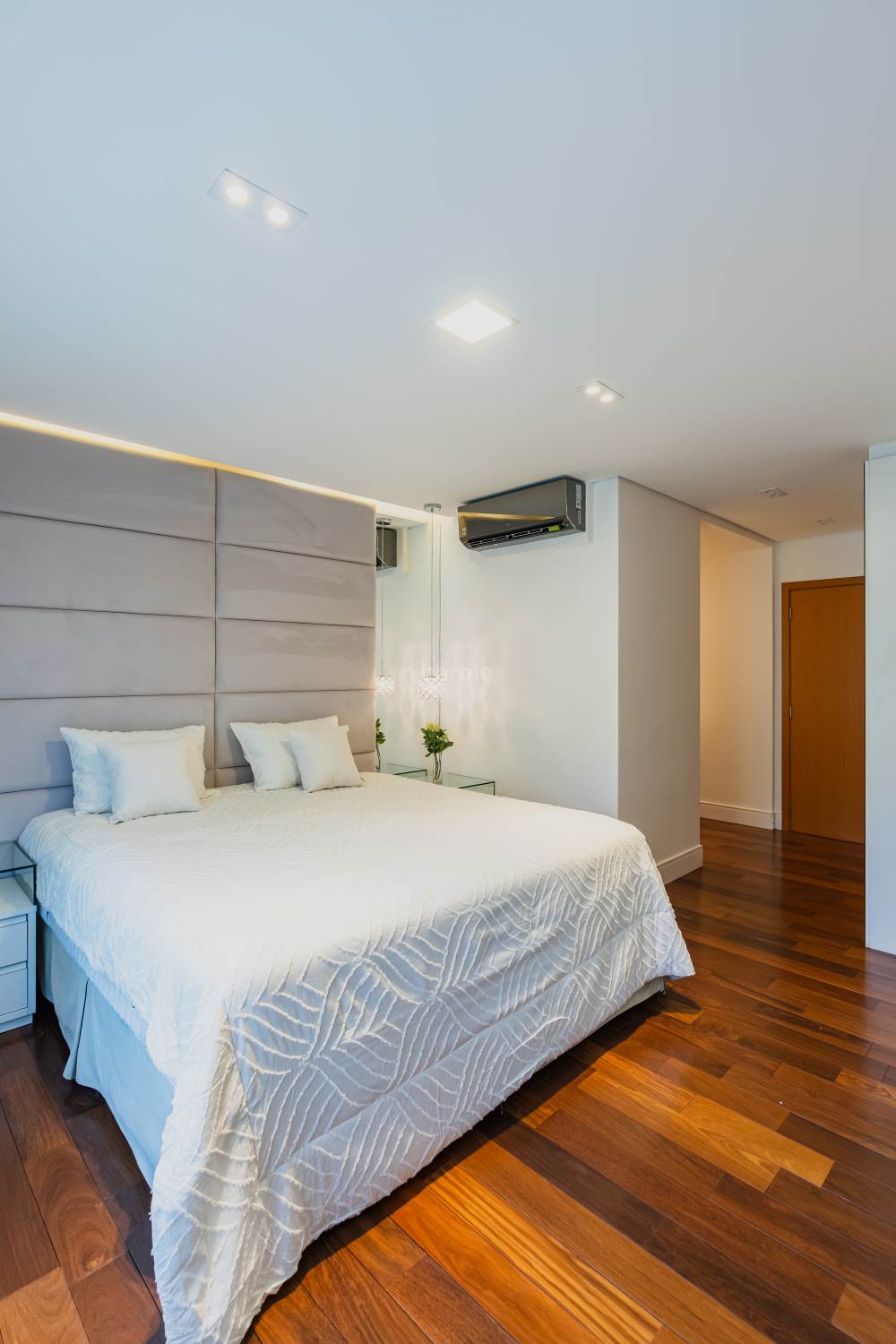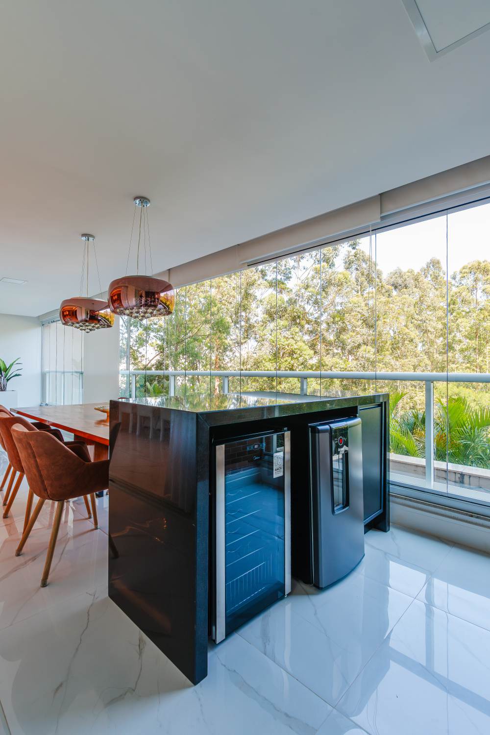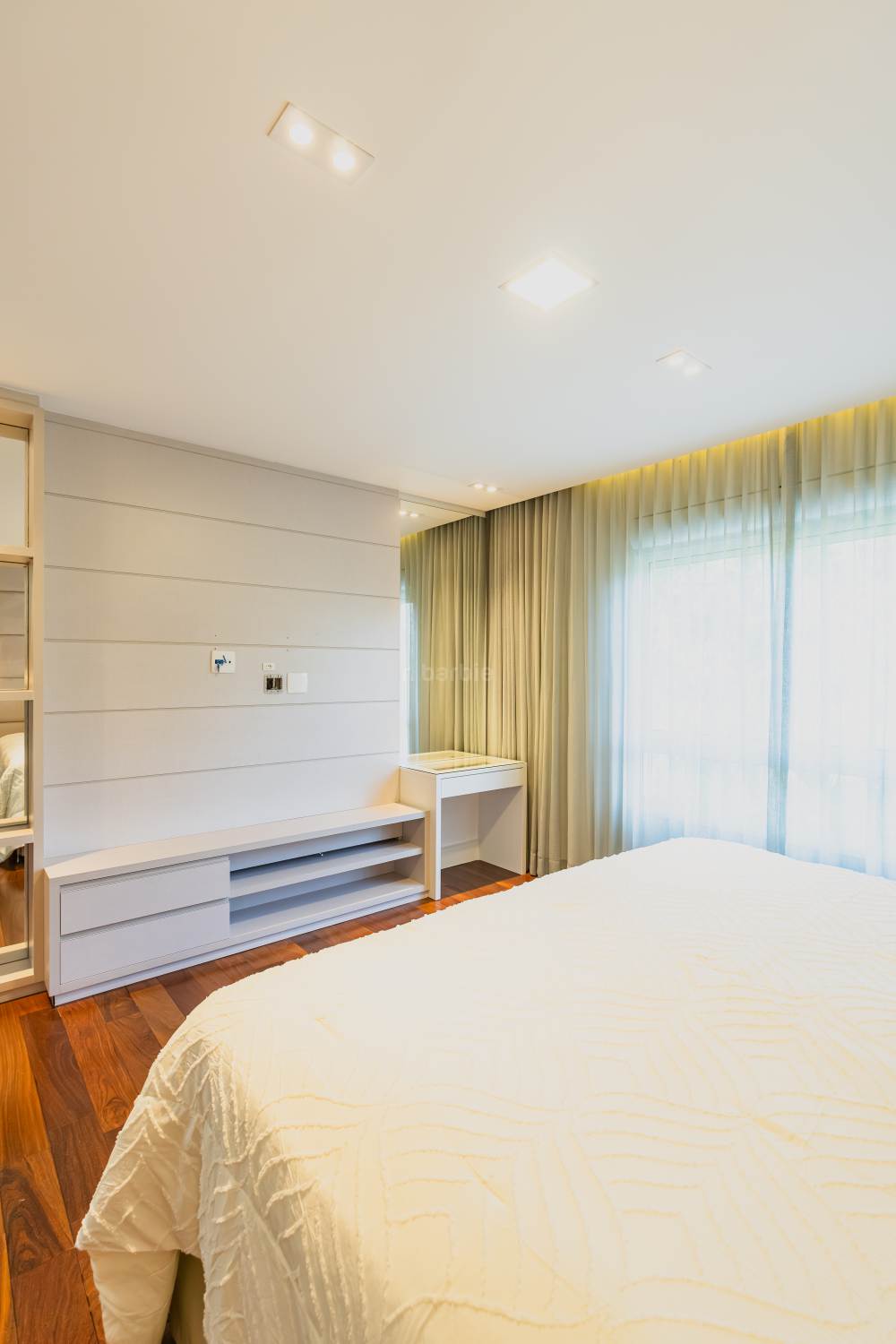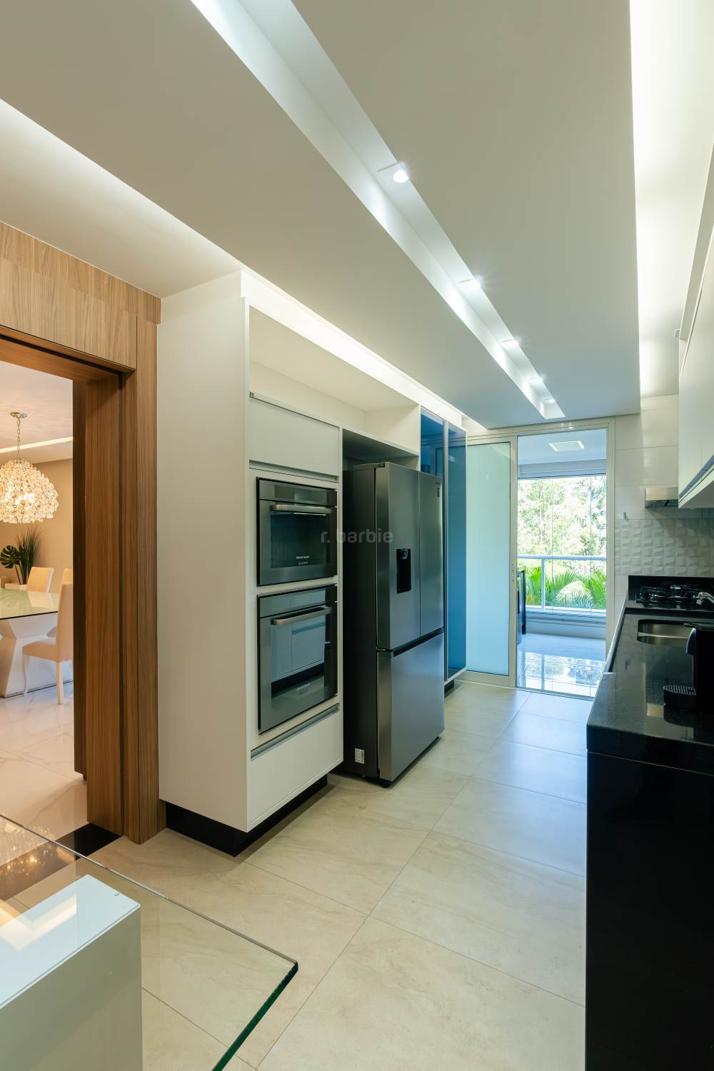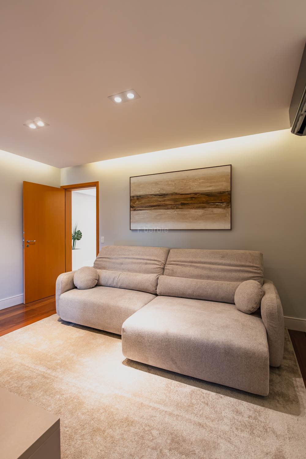 Apartamento semi mobiliado com 3 suítes em Alphaville, 224 metros, living para 3 ambientes, cozinha ampla com armários planejados ID Móveis e eletrodomésticos, ar condicionado, lavanderia despensa, lavabo, varanda gourmet com churrasqueira a carvão, vista para mata, depósito no andar e 4 vagas de garagem.