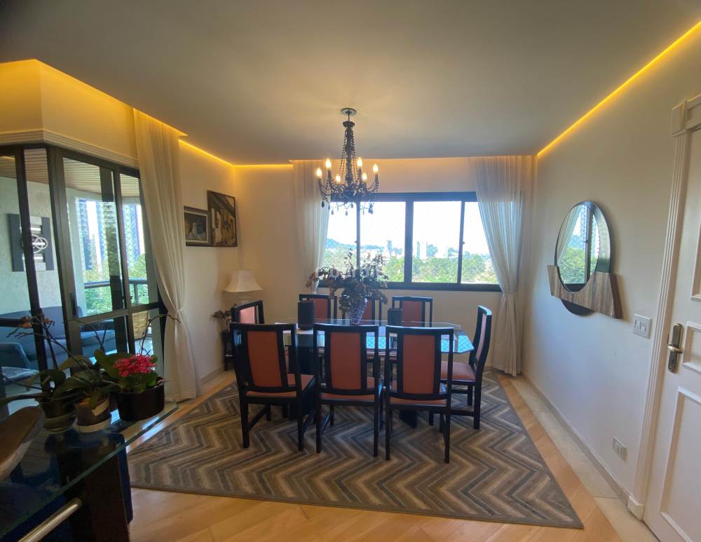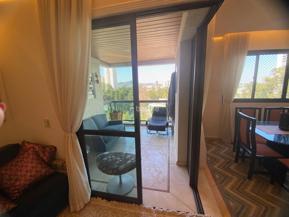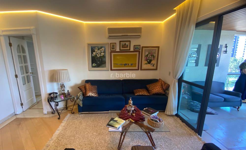 Apartamento com 3 suítes em Alphaville, 118 metros, living para 3 ambientes, cozinha ampla com armários planejados, lavanderia, 5 banheiros, escritório, varanda com tela de proteção e 2 vagas de garagem.
