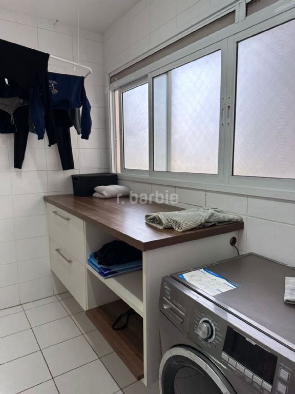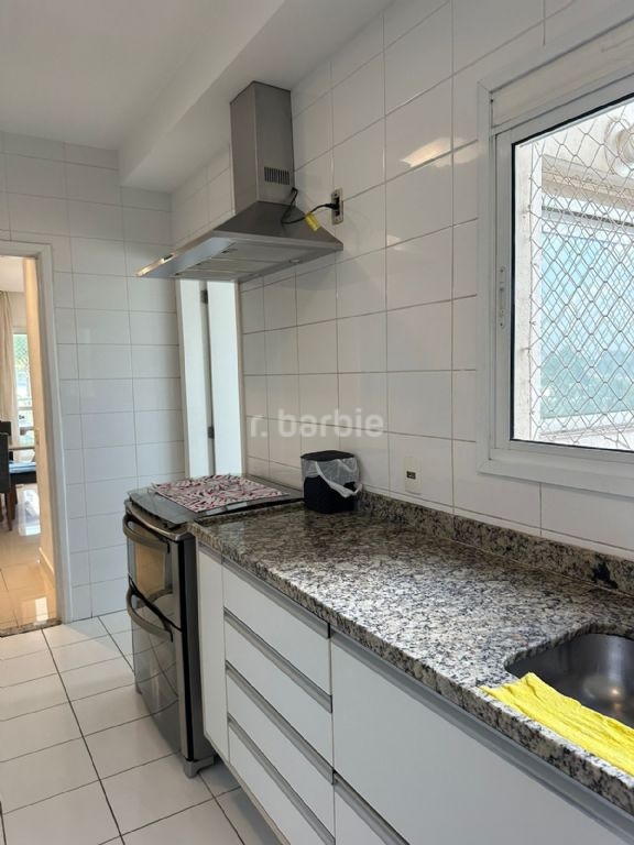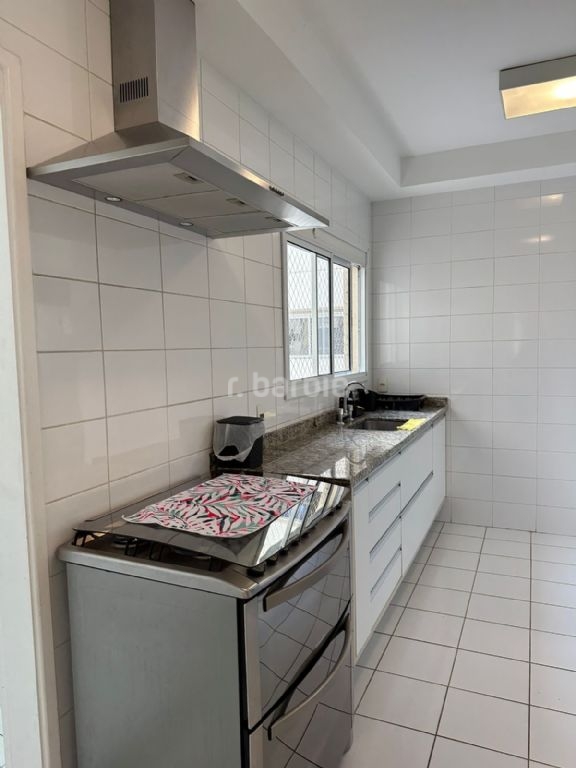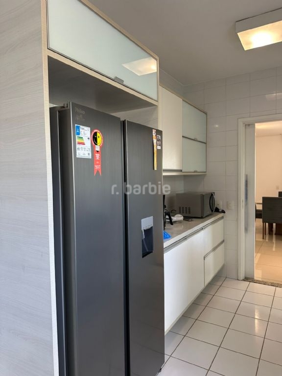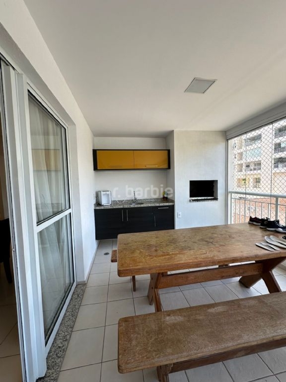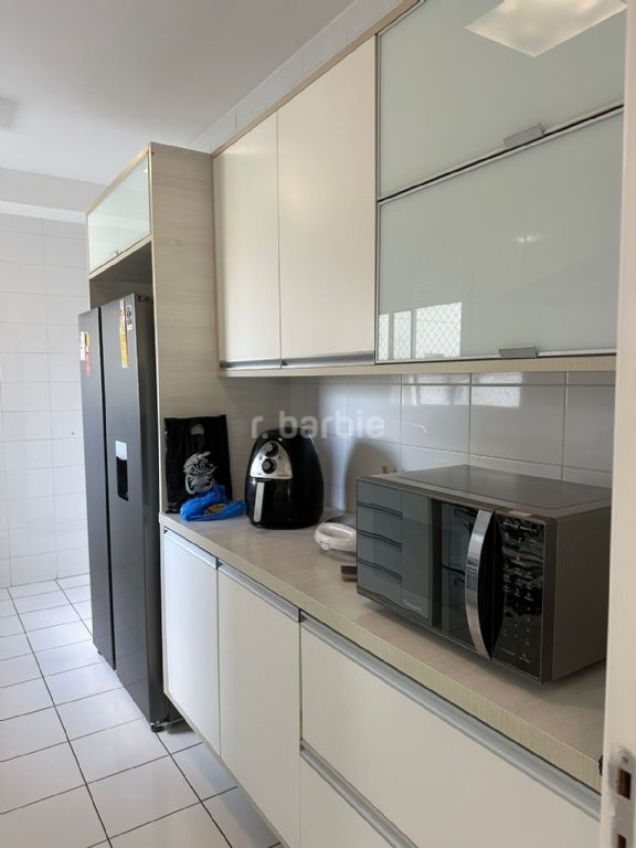 Apartamento em Alphaville com 158 metros, 3 suítes, living integrado para 2 ambientes com ar condicionado, cozinha ampla com armários planejados, lavanderia, 4 banheiros, varanda gourmet com churrasqueira, 1 box na garagem e 3 vagas.