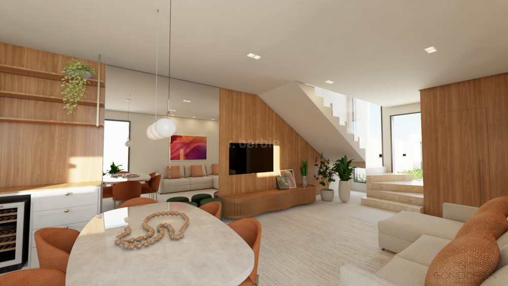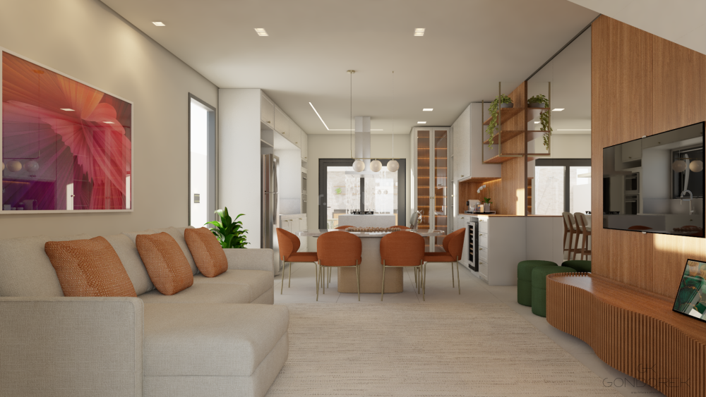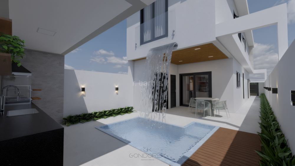 Ao entrar, você encontra uma planta fluida e bem resolvida, com sala de estar e jantar integradas à cozinha com ilha, criando um ambiente moderno e acolhedor. A conexão com a área externa é um dos grandes destaques, com espaço gourmet completo e uma charmosa piscina com cascata e automação — ideal para momentos de lazer e convivência.
