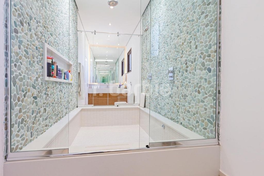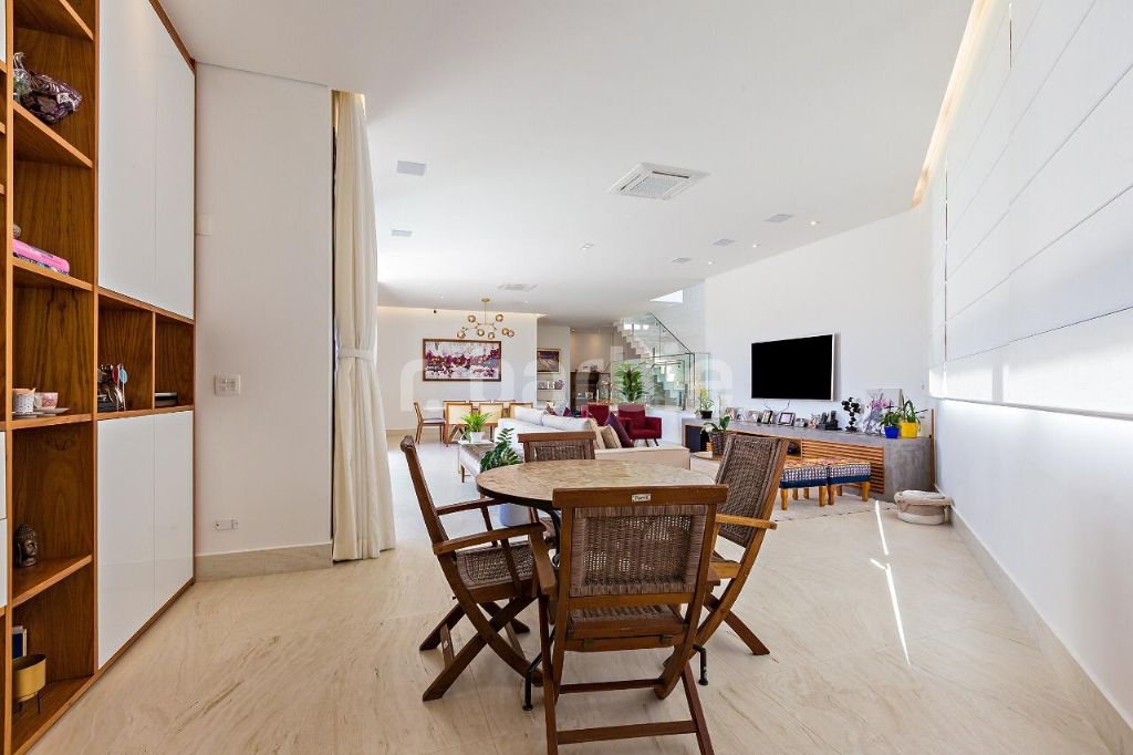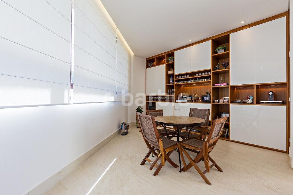 Conta com acabamentos de primeira qualidade, modernos e de alto padrão, repleta de armários da Dedicatto Mobília, escadas em mármore travertino romano bruto, banheiros em mármore Branco Prime, Área Gourmet em Quartzo Cinza Claro, Piscina com Pedra Vulcânica Hijau da Palimanan, Metais Hans Grohe, Louças TOTO e Deca.