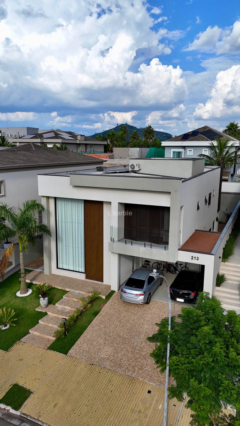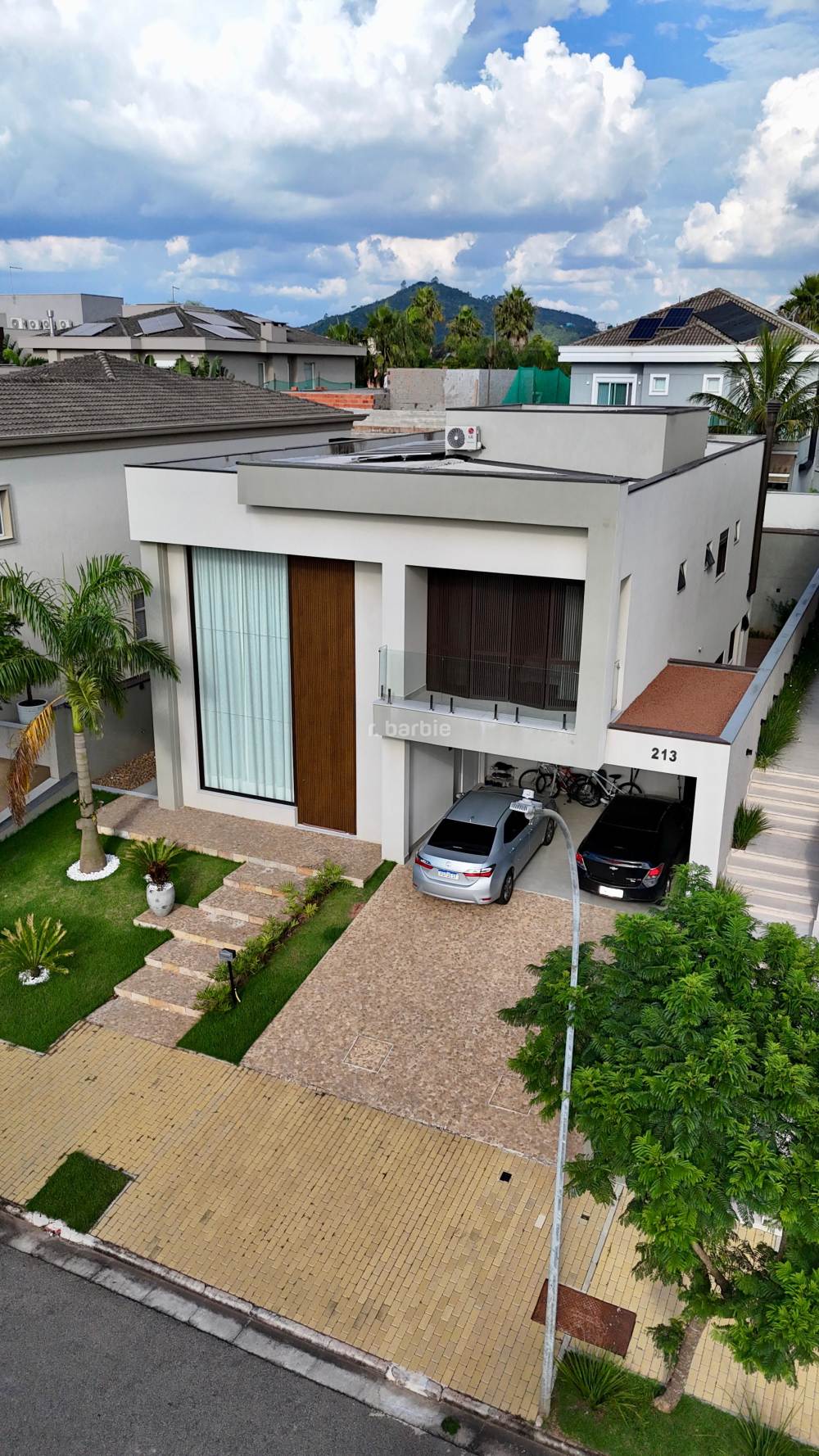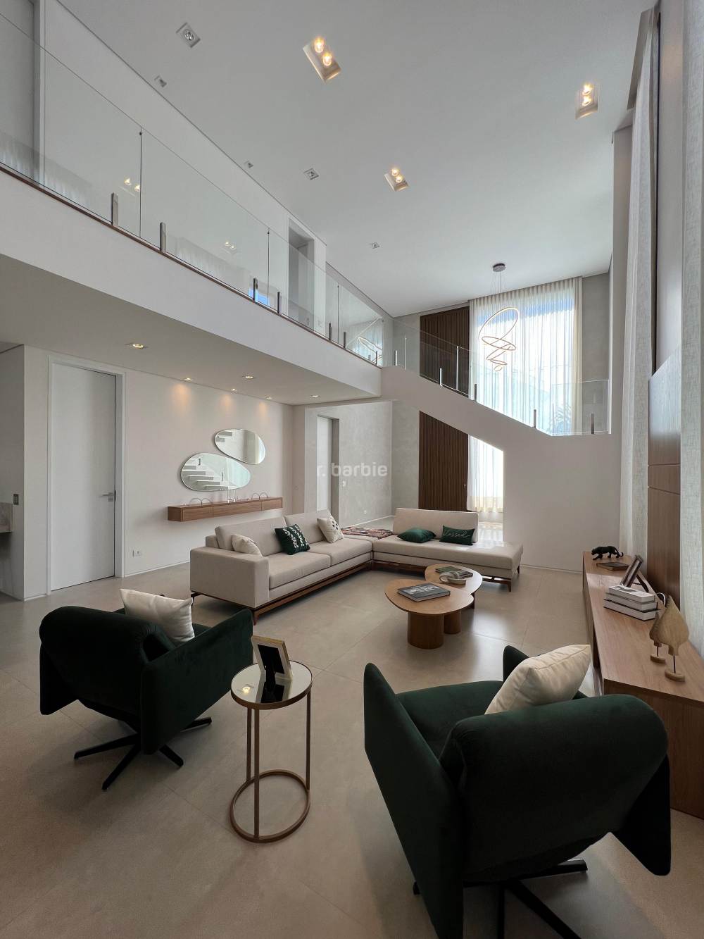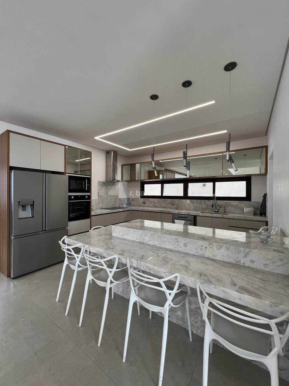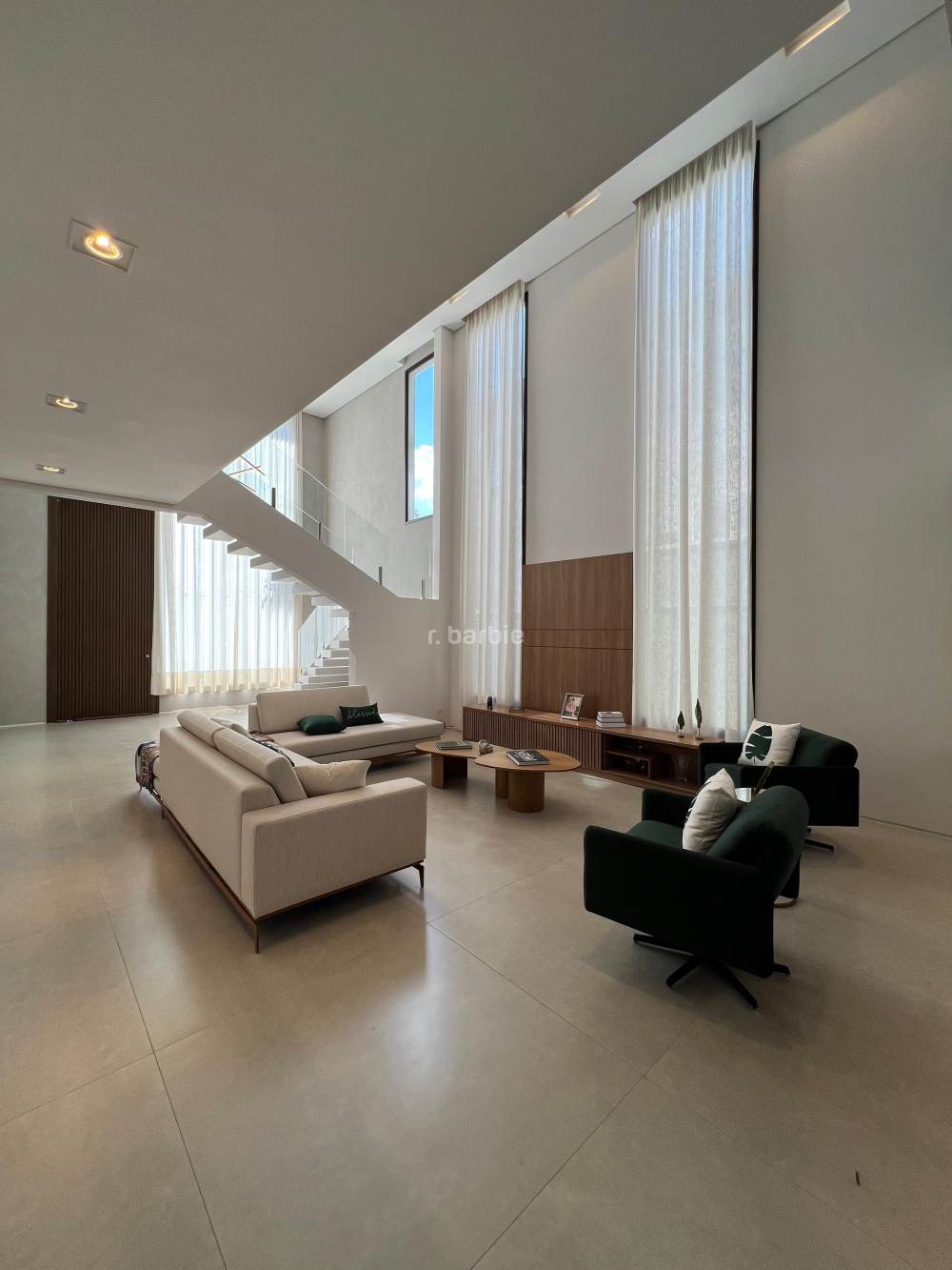 Casa recém construída com 4 suítes em Alphaville, 441 metros de terreno e 349 metros de área construída, living para 3 ambientes, cozinha ampla com armários planejados, lavabo, área gourmet com churrasqueira e ilha, piscina e 4 vagas de garagem.