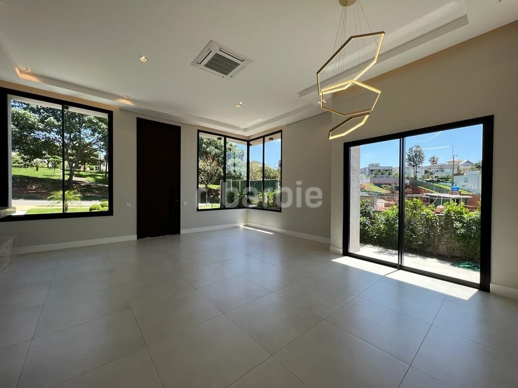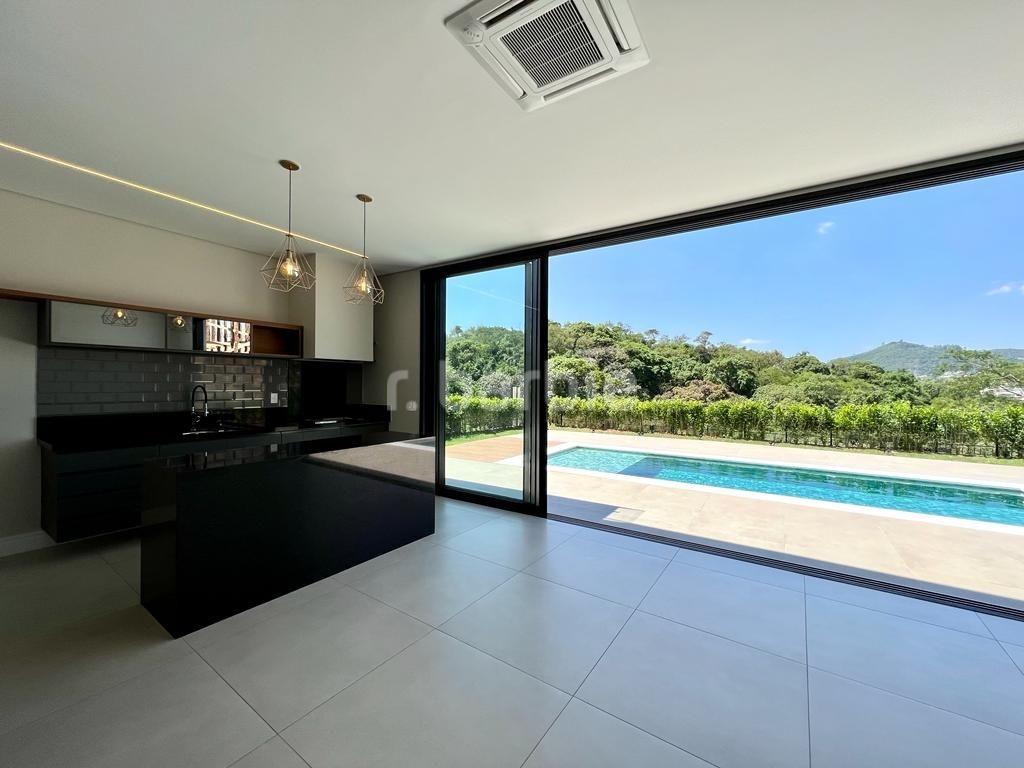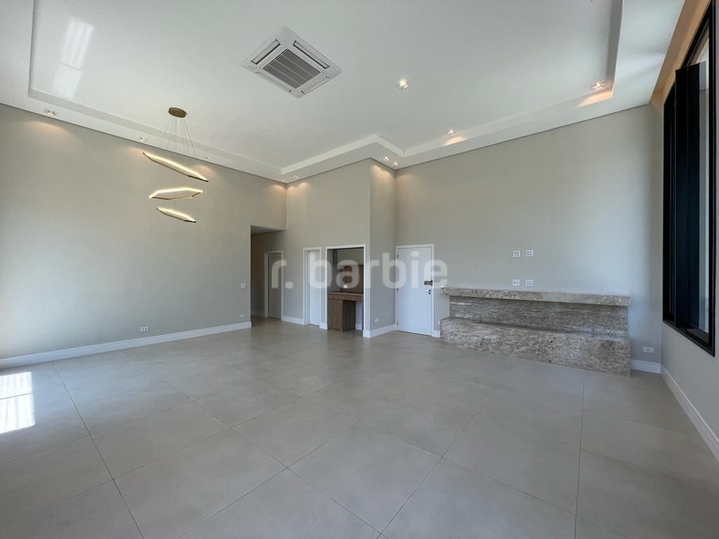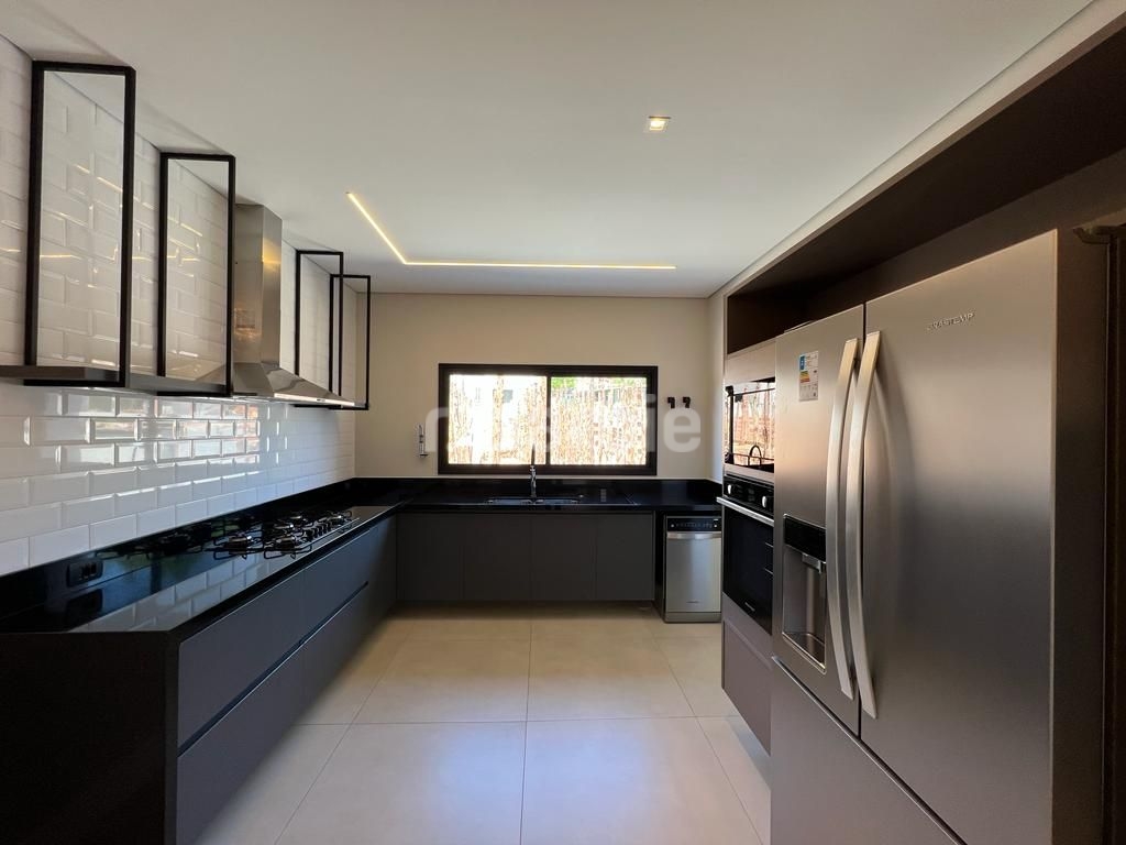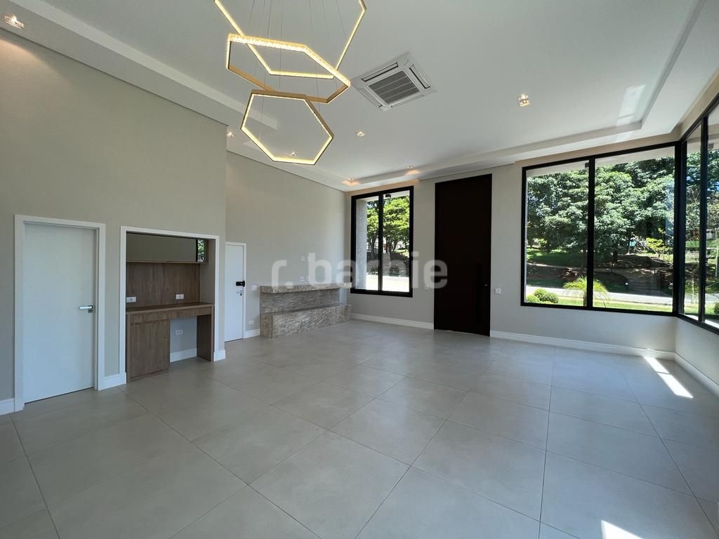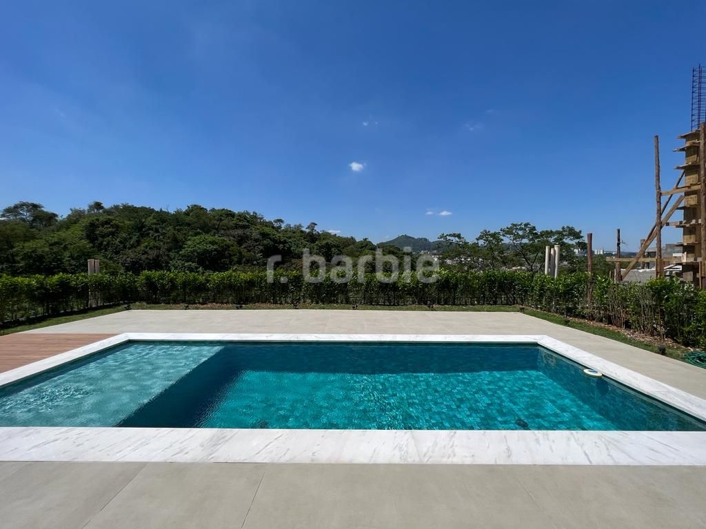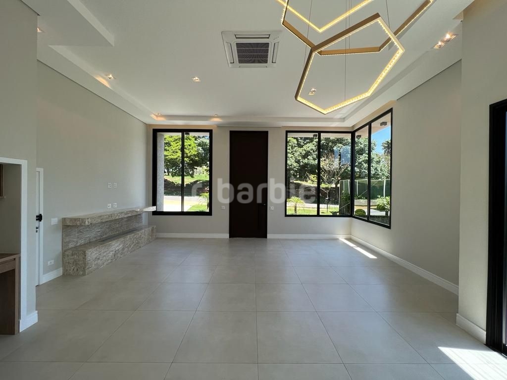 Linda casa recém construída com 691 metros de terreno e 428 metros de área construída, 4 amplas 4 amplas suítes, living para 3 ambientes com pé direito, ampla área gourmet integrando os ambientes, piscina com prainha e vista para reserva, escritório, aspiração central, closet, lareira, lavabo, dependência de empregada e 6 vagas de garagem.
