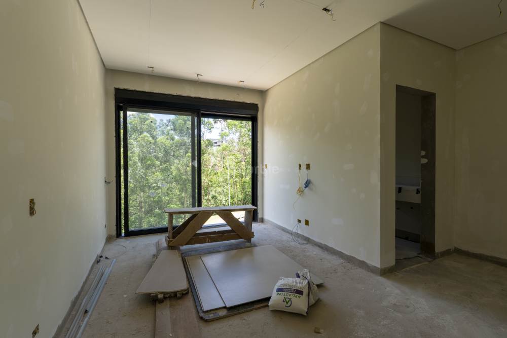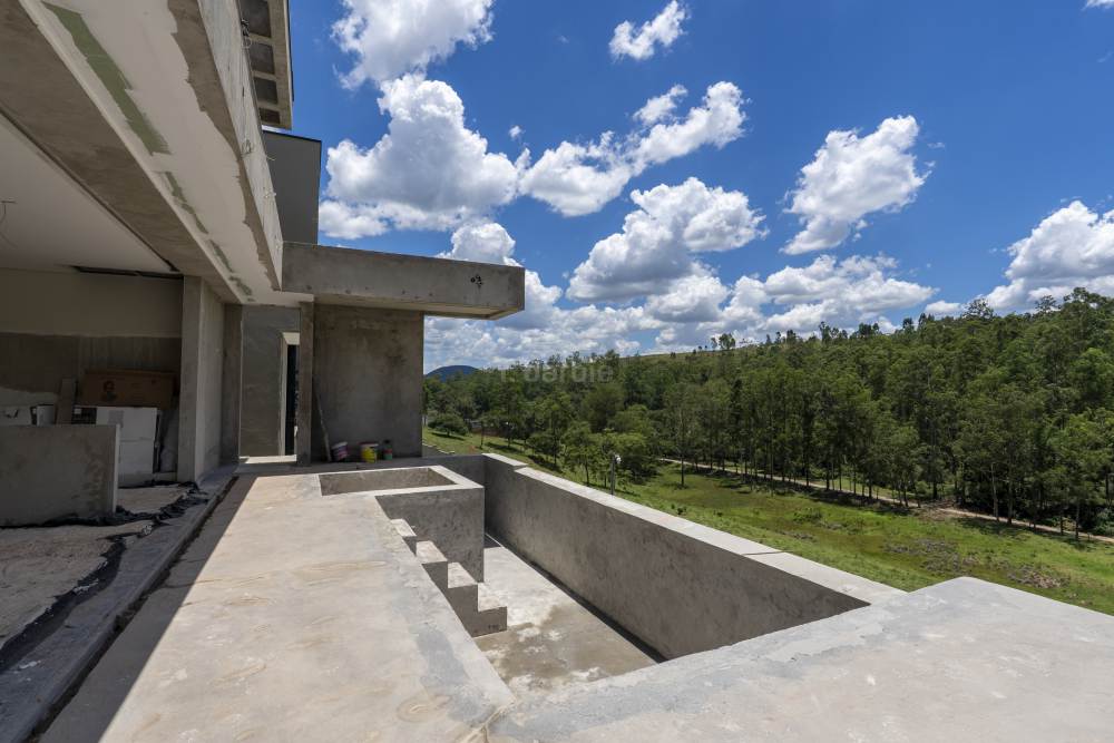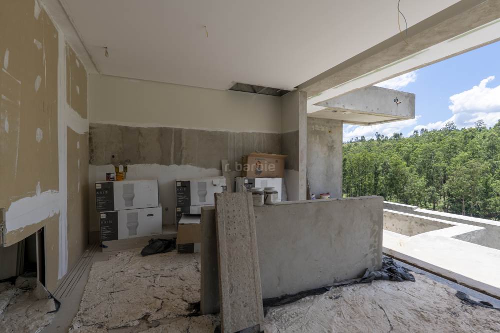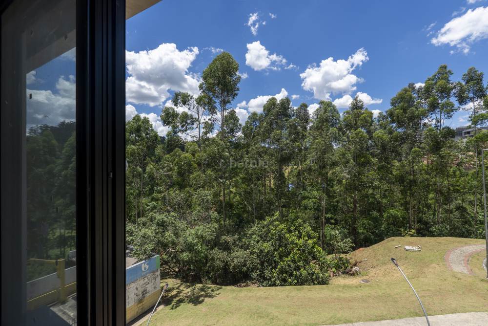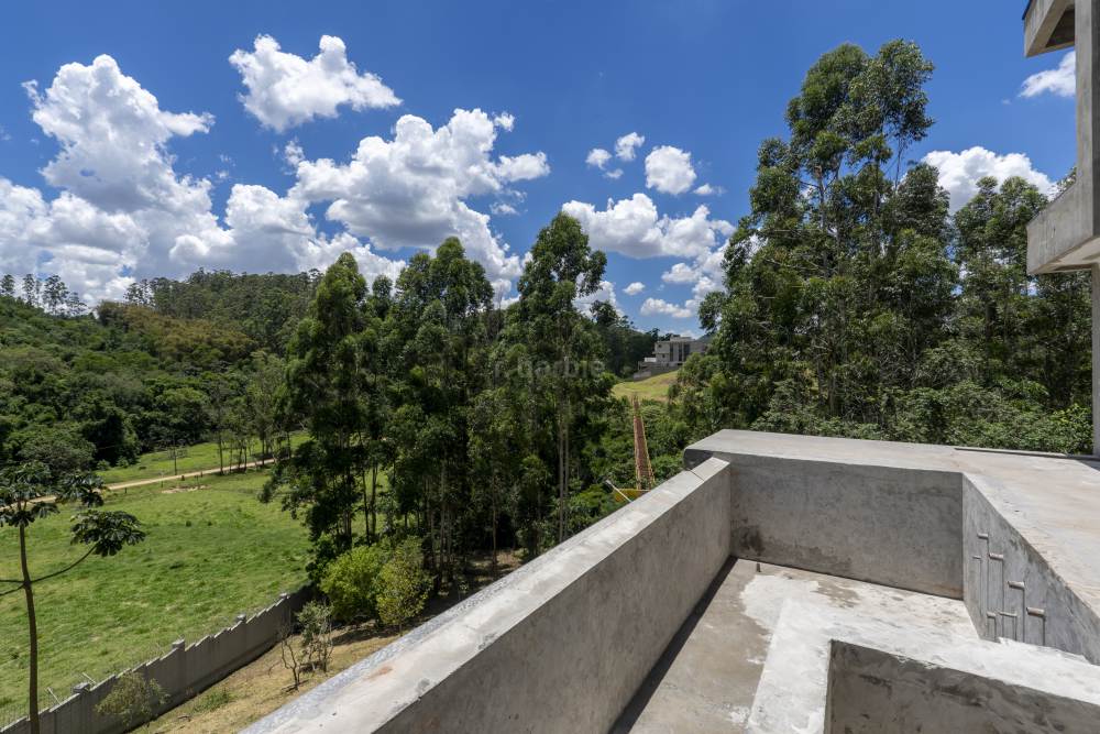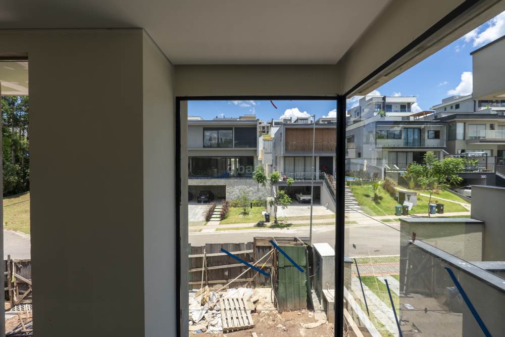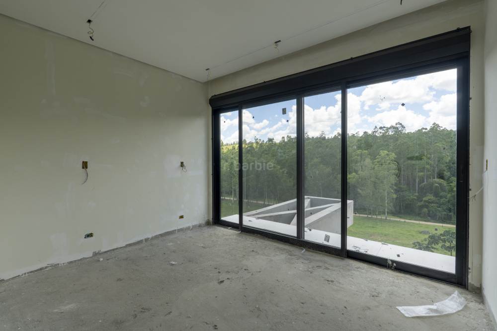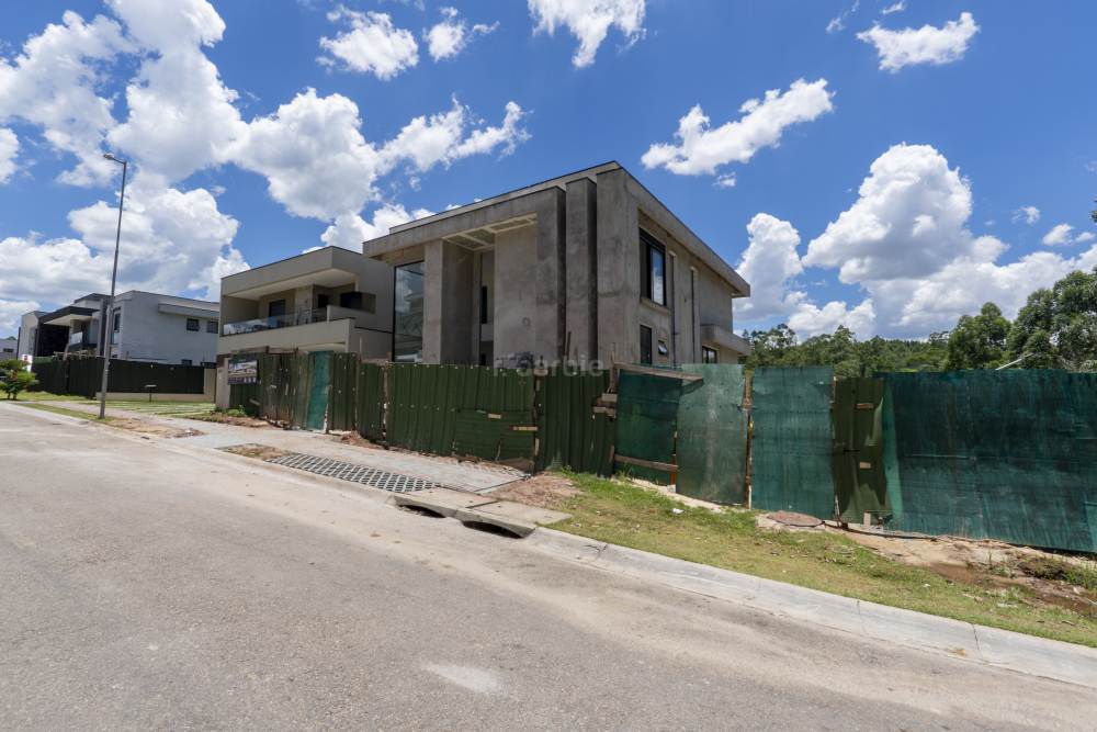 Casa com 4 suítes em Alphaville, 420 metros de terreno e 456 metros de área construída, living para 3 ambientes, cozinha em conceito aberto, 7 banheiros, elevador com telemetria remota e automação, despensa, lavanderia, suíte para prestador de serviço, escritório, depósito, área gourmet, piscina com borda infinita, sauna úmida e jacuzzi, vista para mata e garagem para 5 carros.