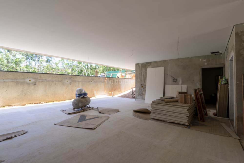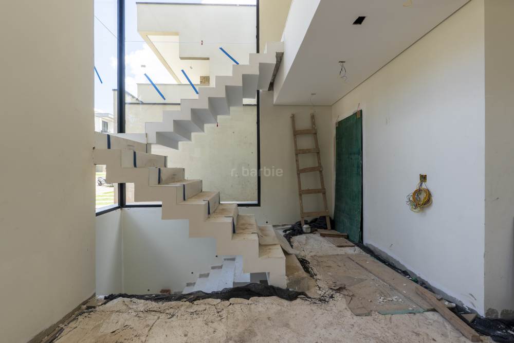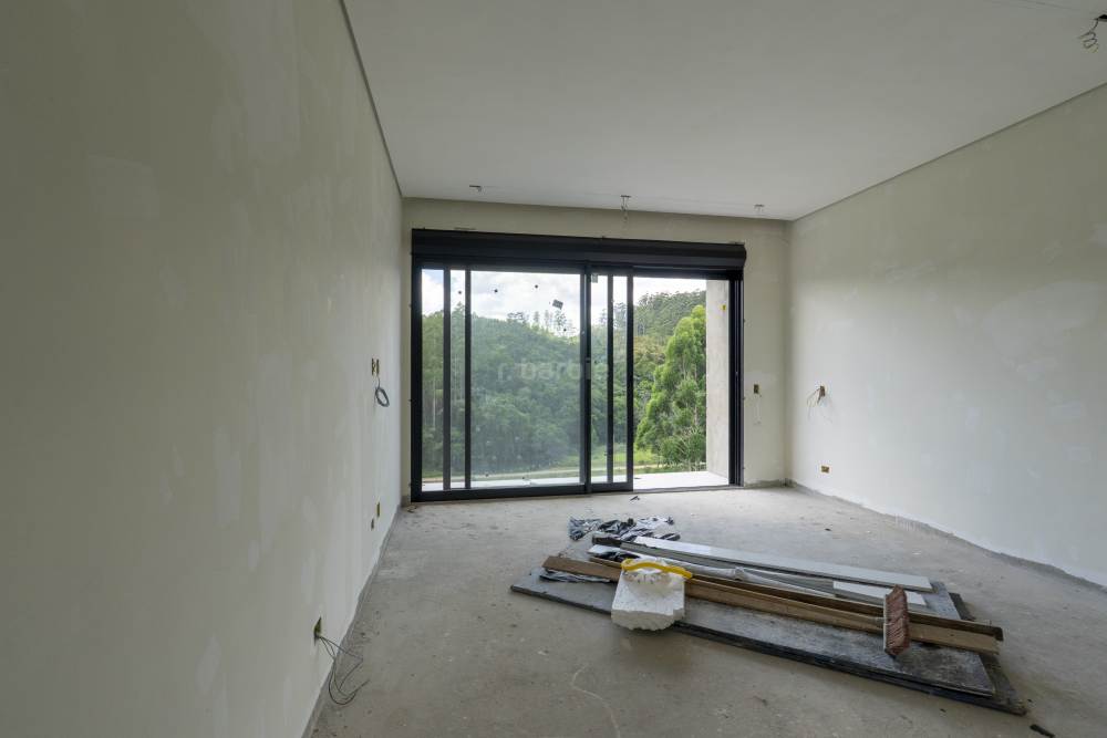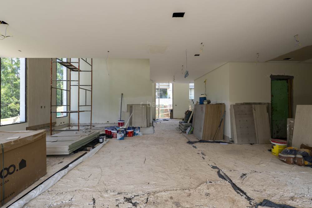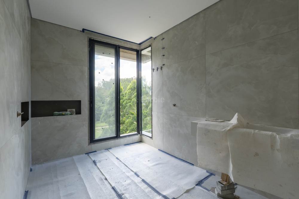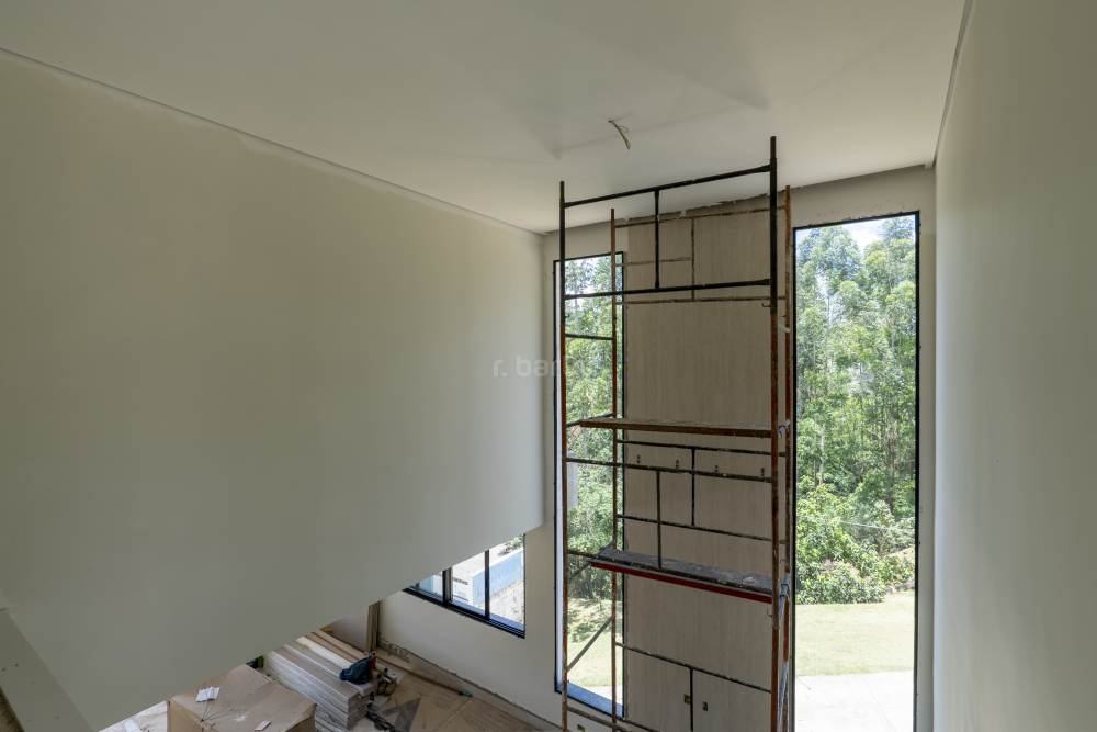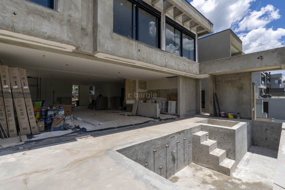 Casa com 4 suítes em Alphaville, 420 metros de terreno e 456 metros de área construída, living para 3 ambientes, cozinha em conceito aberto, 7 banheiros, elevador com telemetria remota e automação, despensa, lavanderia, suíte para prestador de serviço, escritório, depósito, área gourmet, piscina com borda infinita, sauna úmida e jacuzzi, vista para mata e garagem para 5 carros.