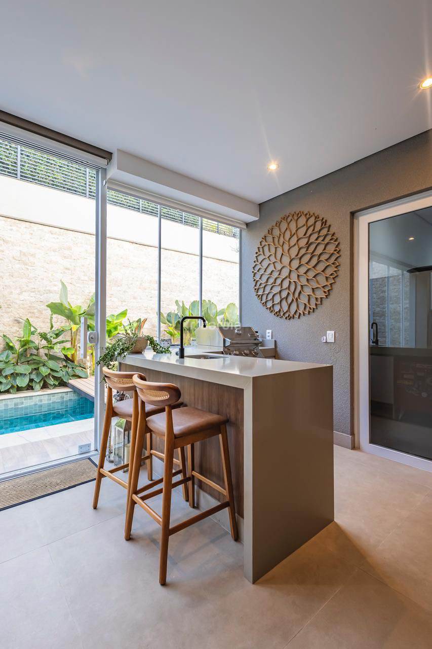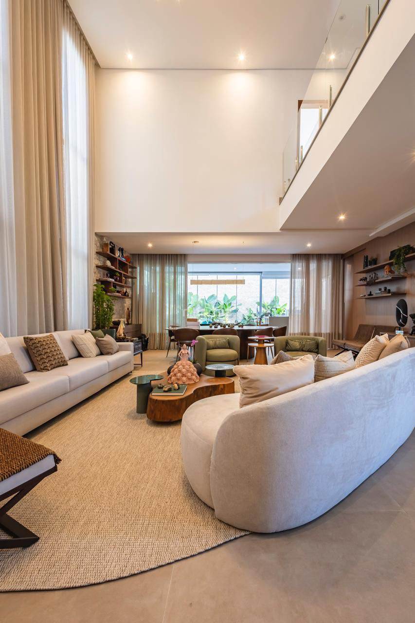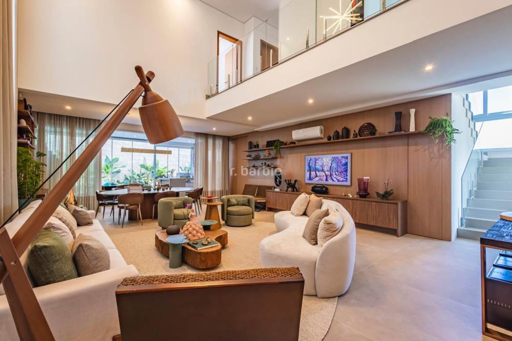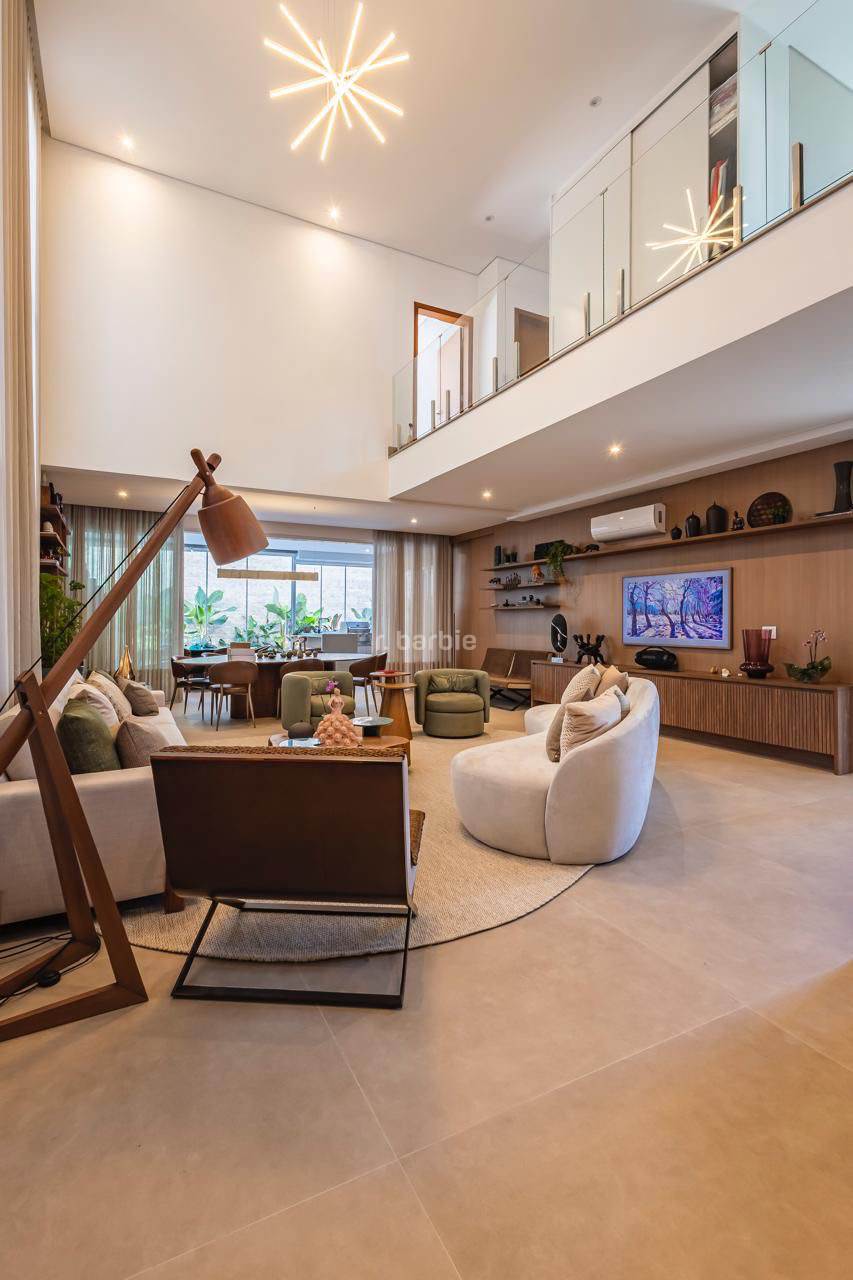 Casa em Alphaville com 420 metros de terreno e 390 metros de área construída, 4 suítes com closet e ar condicionado, living para 3 ambientes, cozinha em conceito aberto com armários planejados e embutidos, despensa, lavanderia, suíte para prestador de serviço, 7 banheiros, área gourmet com churrasqueira, piscina e garagem para 4 carros.