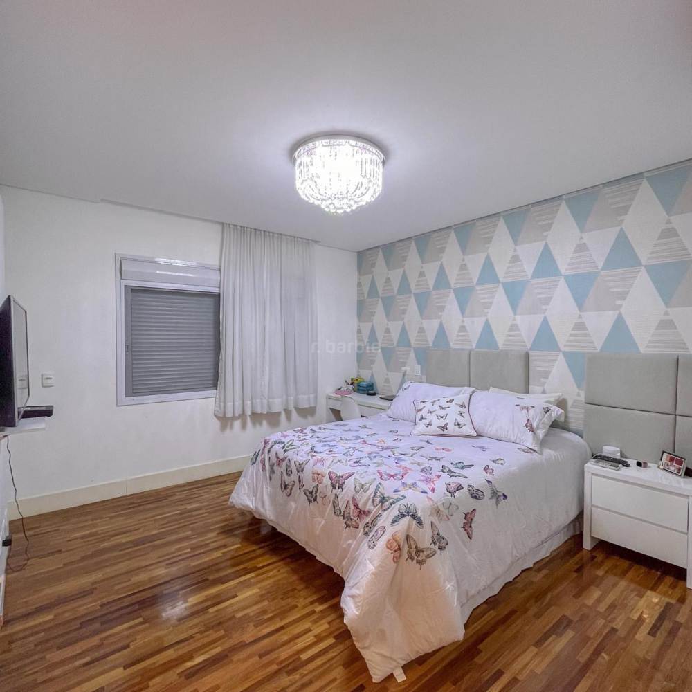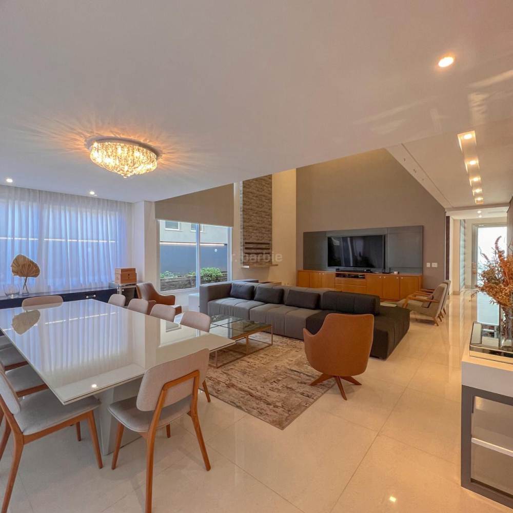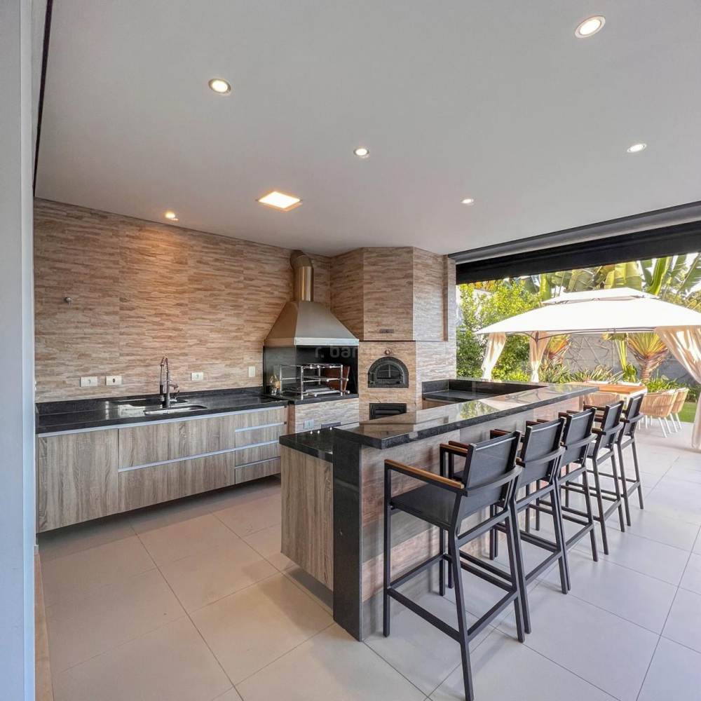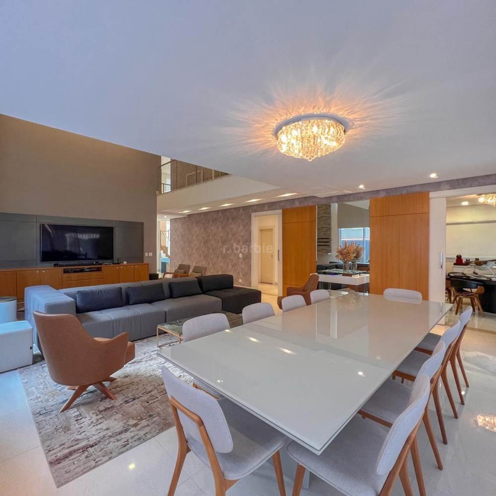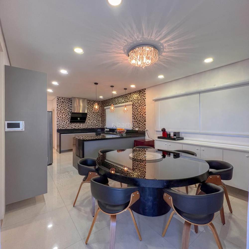 Casa mobiliada em Alphaville, 5 suítes sendo master com hidromassagem e varanda privativa, 598 metros de terreno e 515 metros de área construída, living integrado para 3 ambientes, cozinha ampla com armários planejados e eletrodomésticos, lavanderia, lavabo, dormitório para prestador de serviço, área gourmet com churrasqueira e forno de pizza, piscina com deck, sauna e garagem para 4 carros.