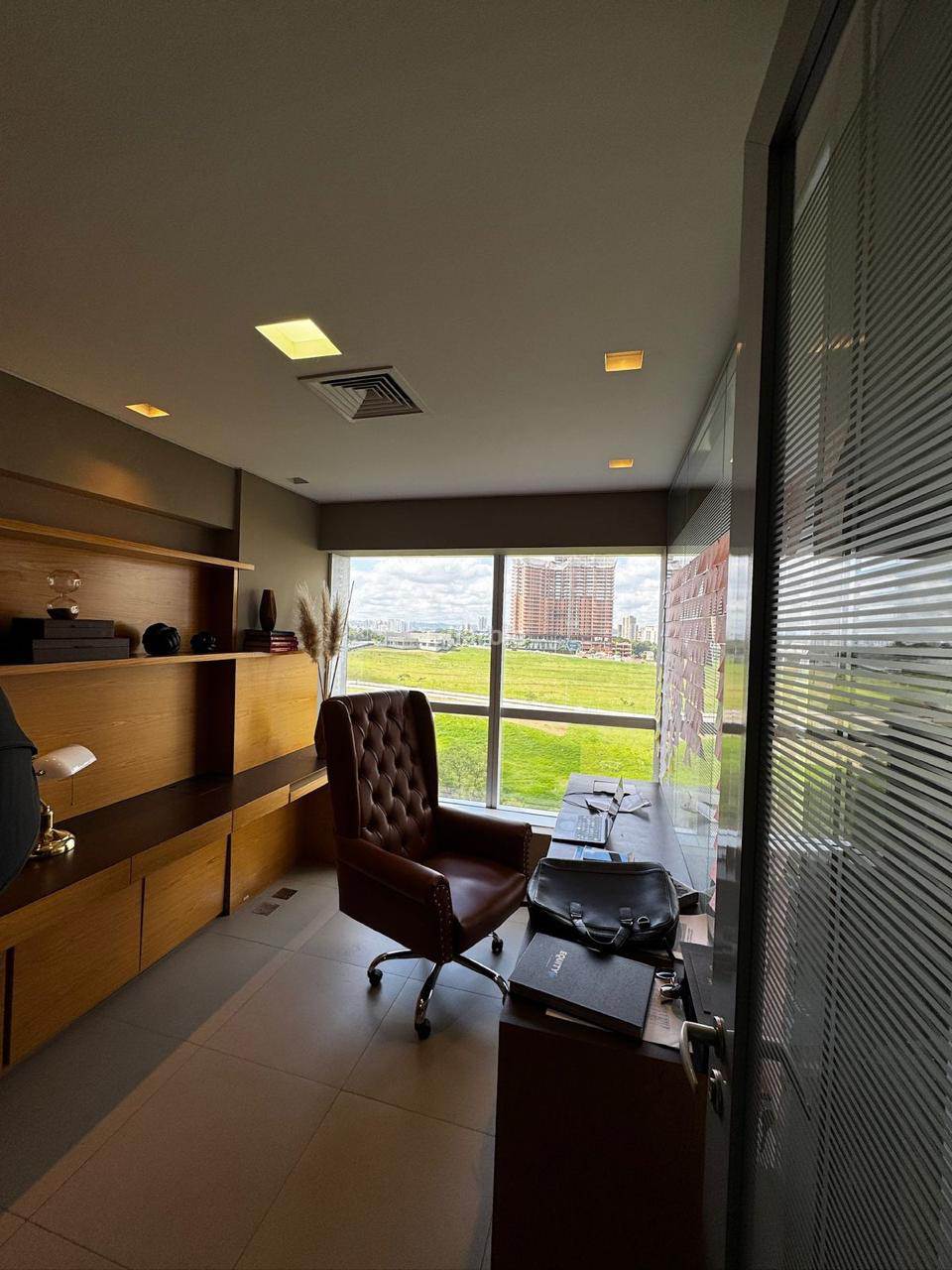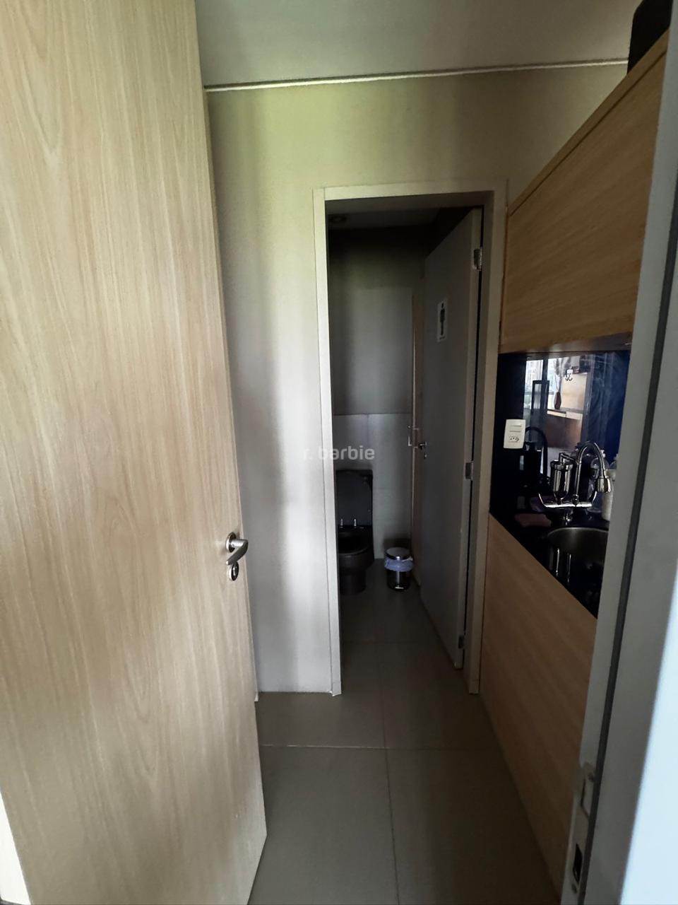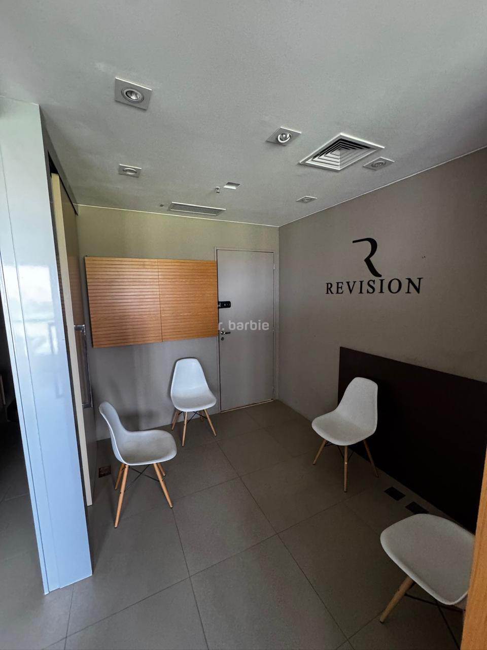 Sala comercial mobiliada em Alphaville, 61 metros, 2 banheiros, divisória para 3 salas, copa, mobília inclusa: cadeiras, televisão, frigobar e micro-ondas e 1 vaga de garagem.