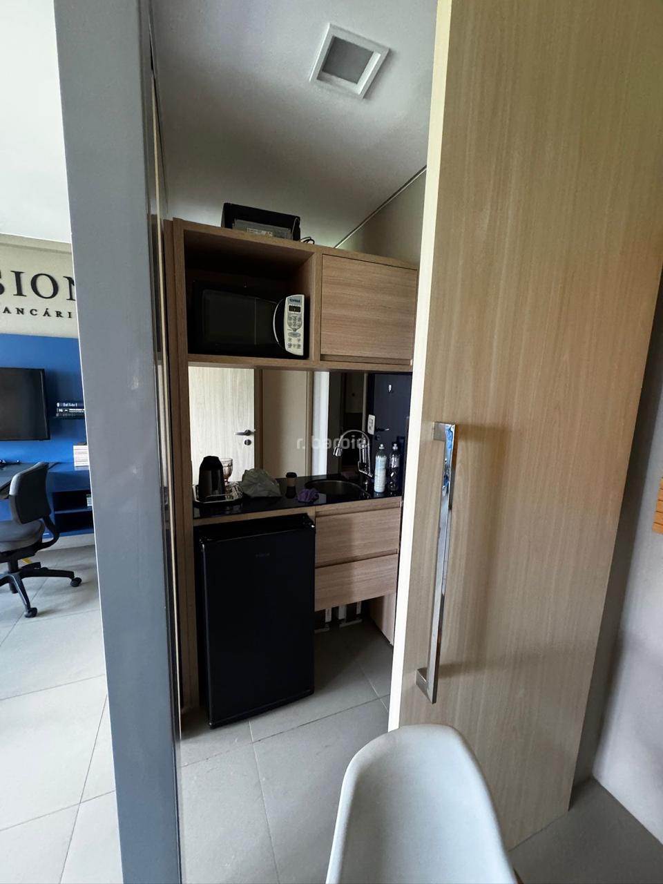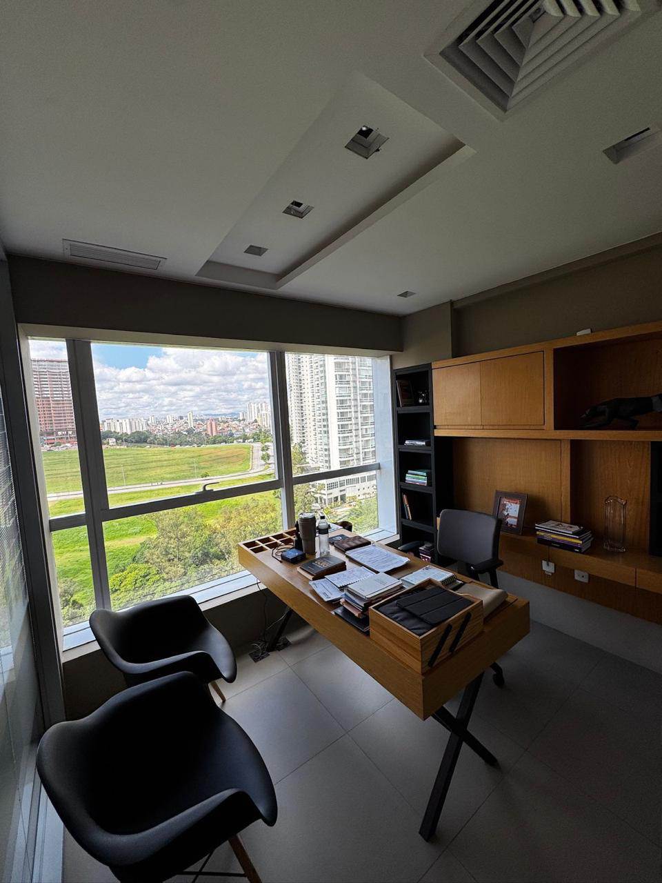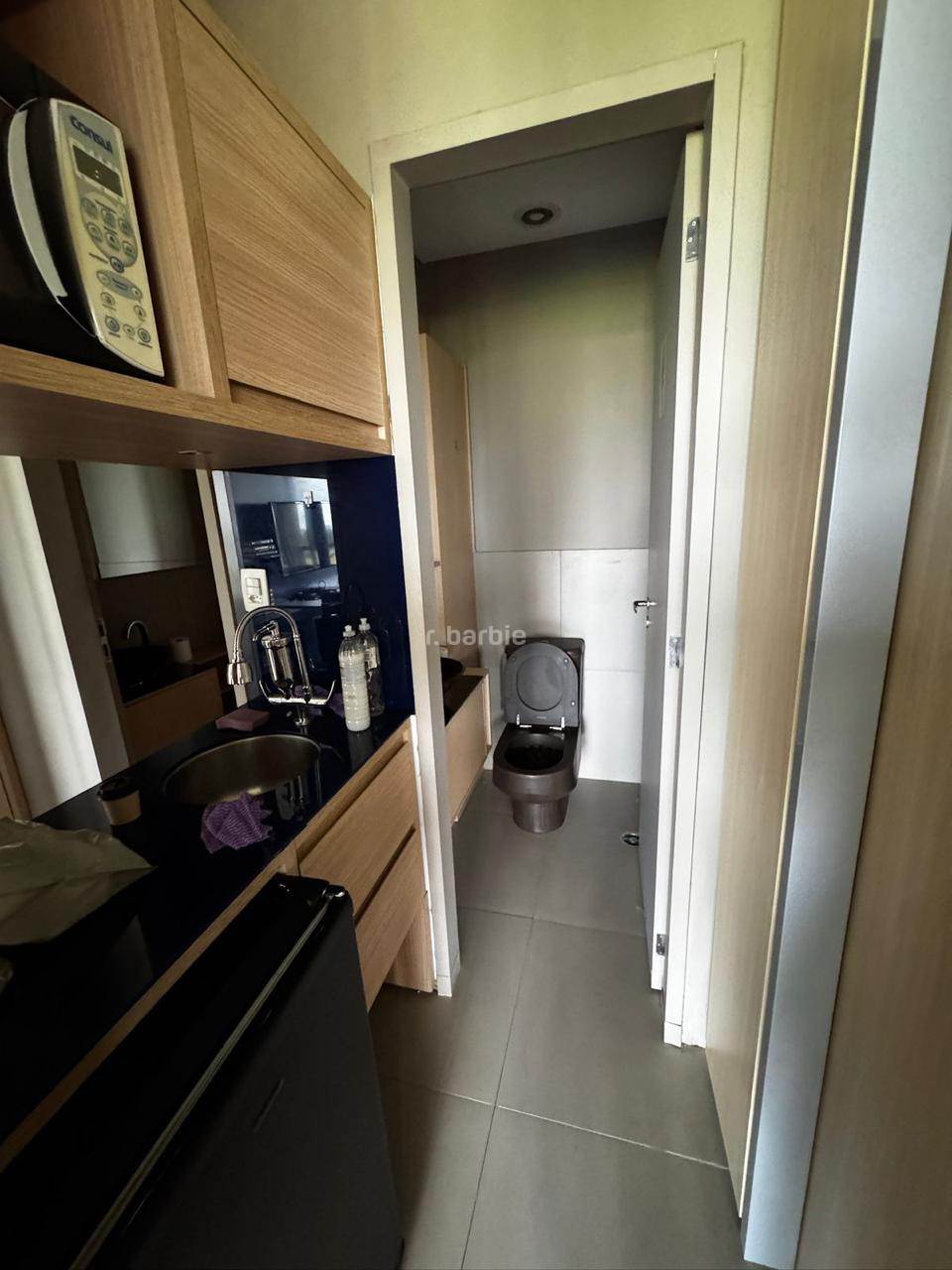 Sala comercial mobiliada em Alphaville, 61 metros, 2 banheiros, divisória para 3 salas, copa, mobília inclusa: cadeiras, televisão, frigobar e micro-ondas e 1 vaga de garagem.